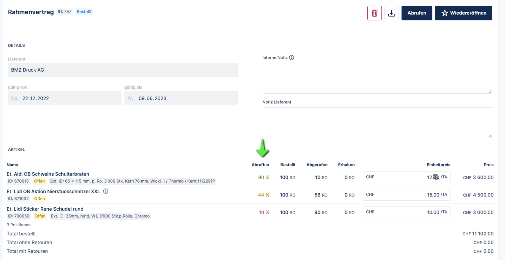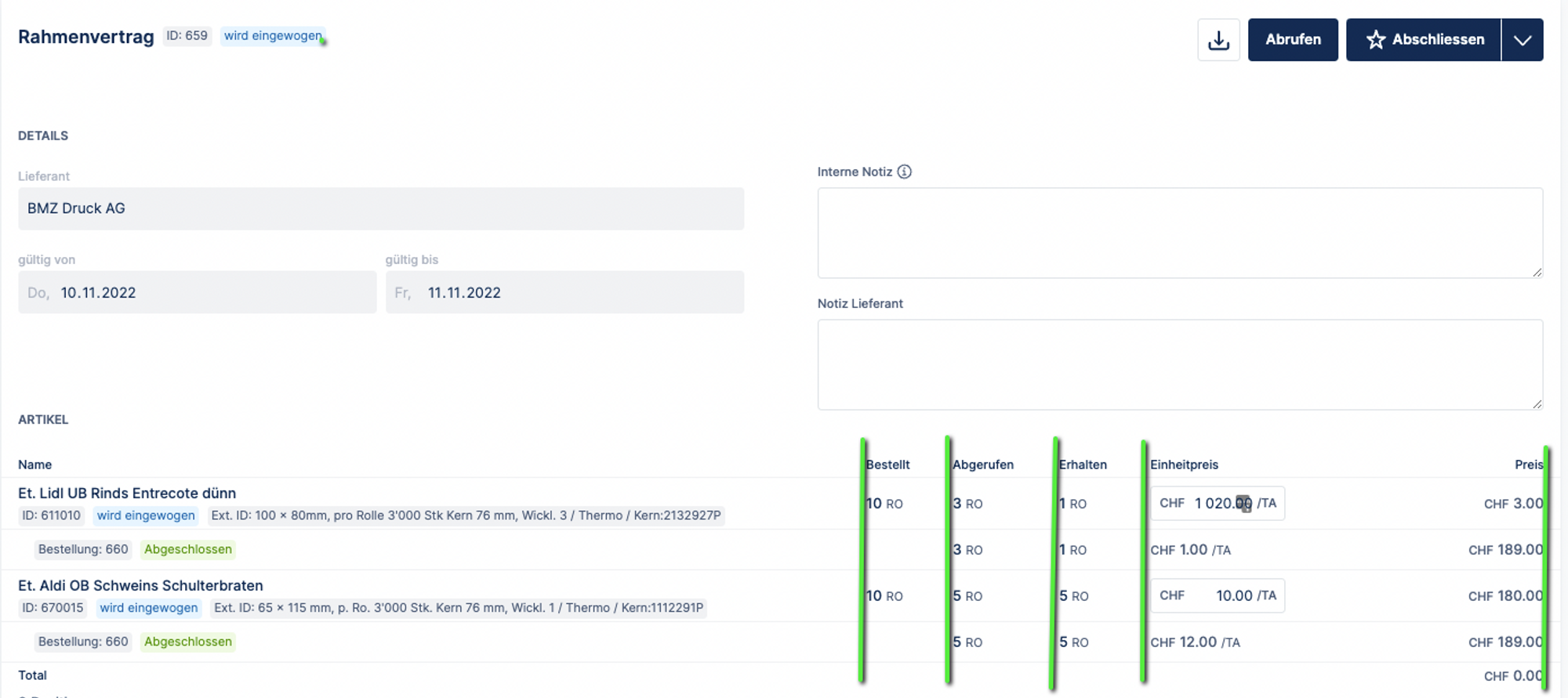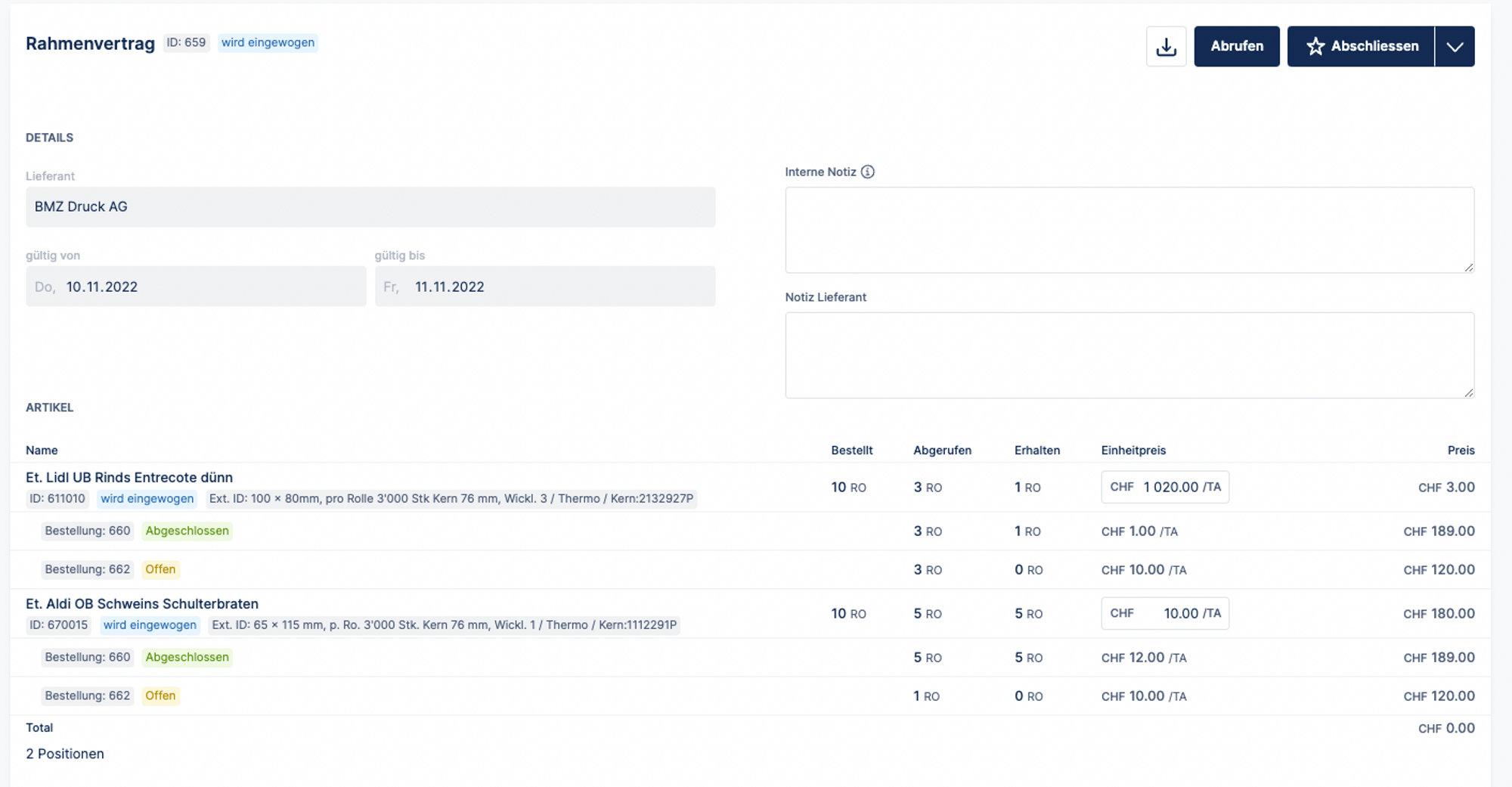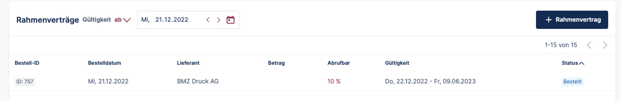 Der mit dem Lieferant vereinbarte Preis aus dem Rahmenvertrag wird auf der Abrufbestellung berücksichtigt.