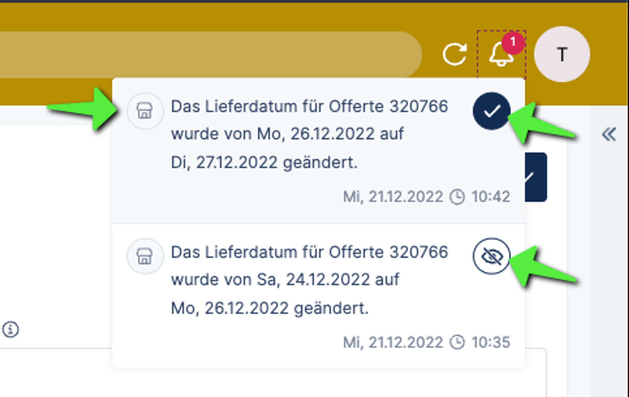 Änderungen eines Lieferdatum bei Offerten von internen Bestellungen.