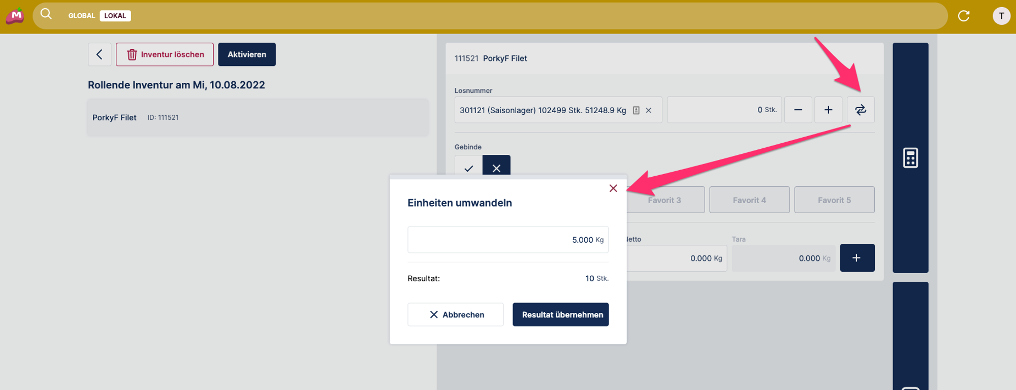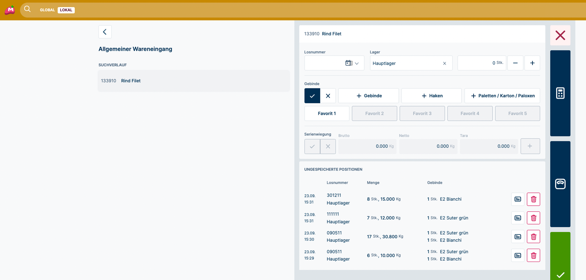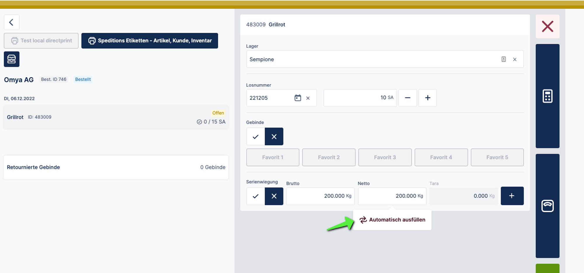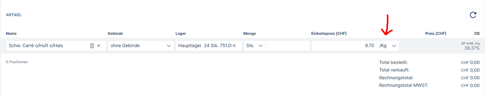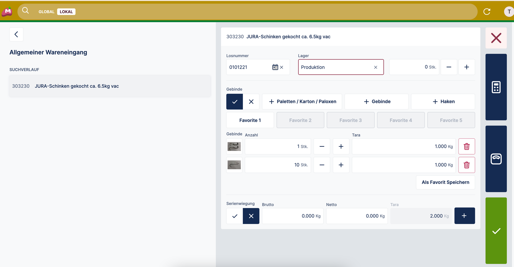 Bei Einkaufsartikeln mit definiertem Umrechungsfaktor (Einkaufseinheit z.B. SA und Werteinheit KG) kann das Netto Gewicht automatisch erfasst werden.