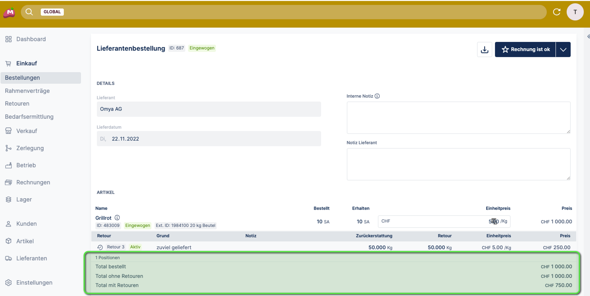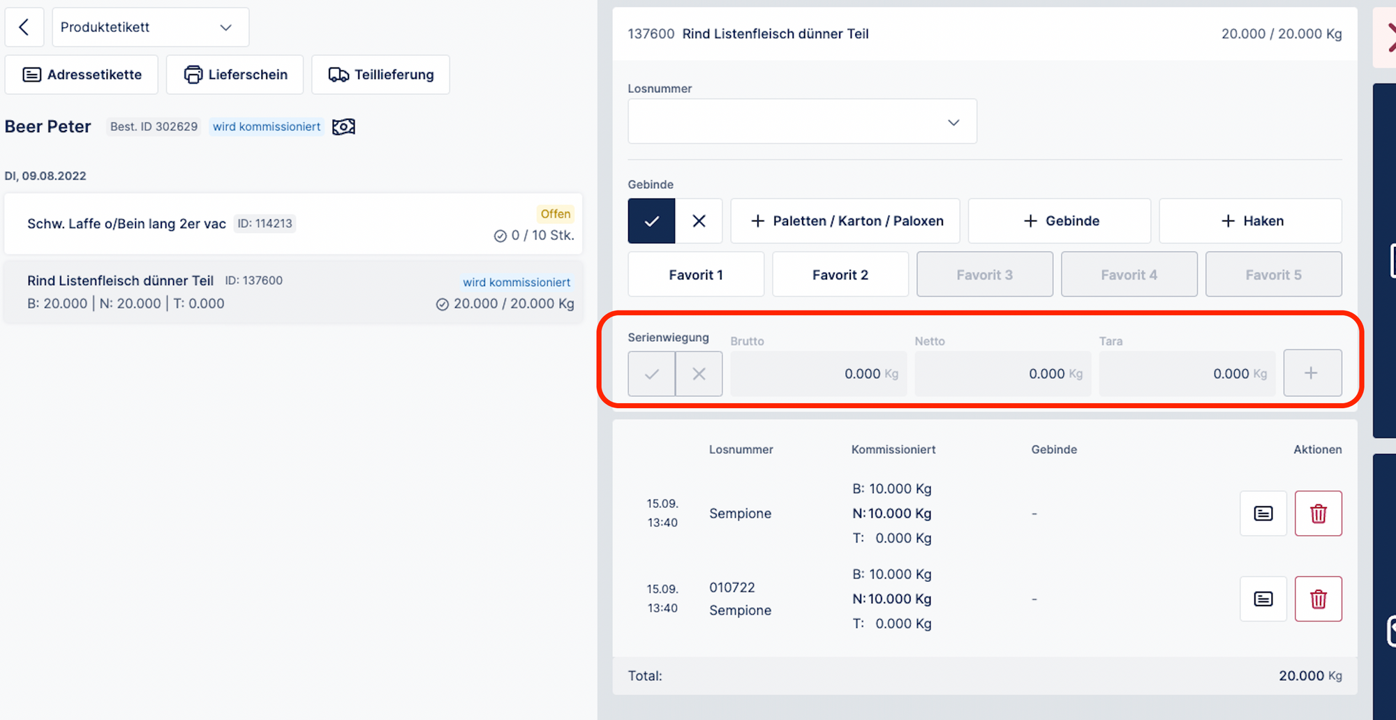 Bessere Übersicht über die eingewogene Position inkl. Ausweisung des Total der eingewogenen Positionen