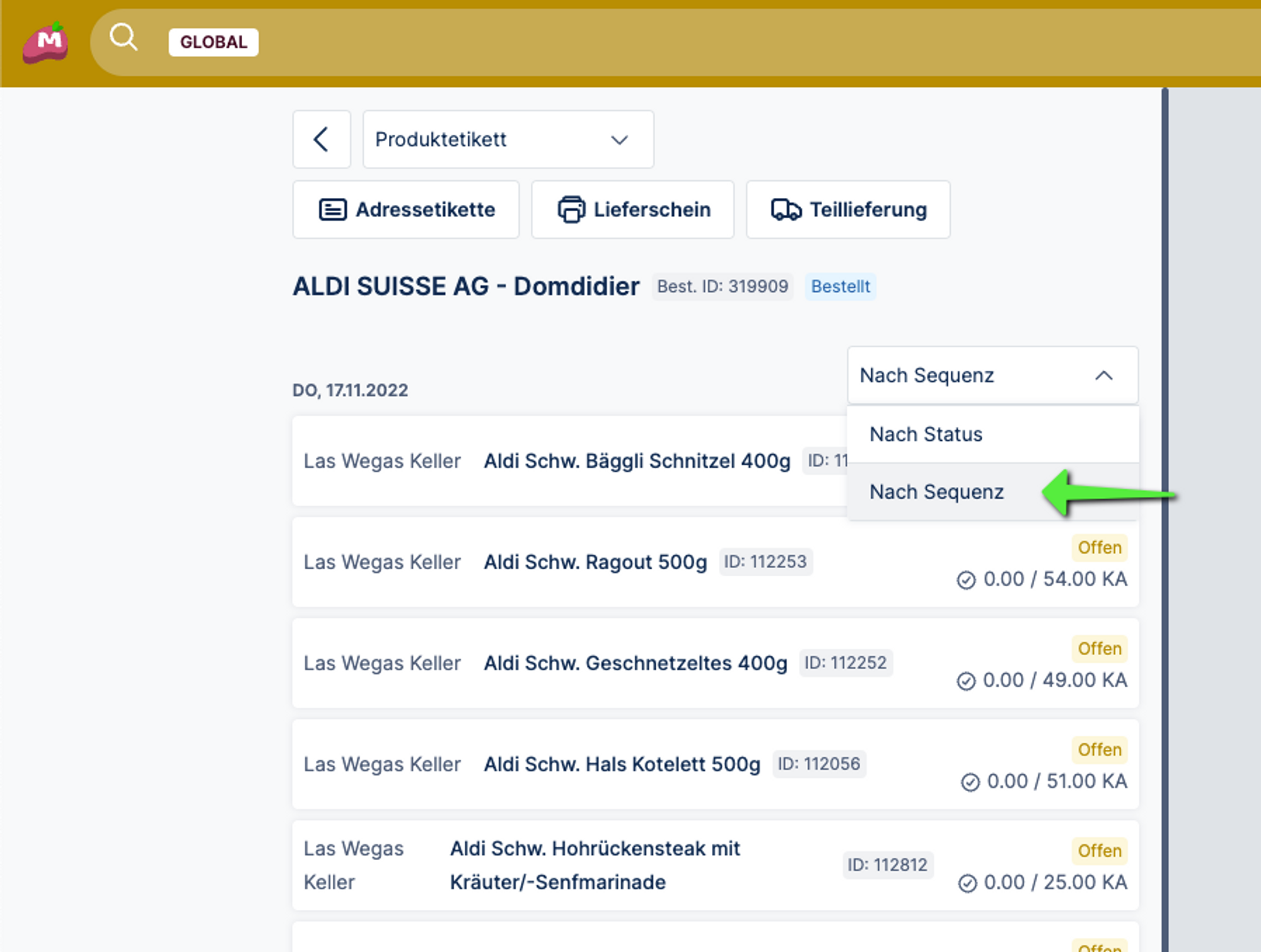 In der Kommissionierungs-Ansicht bleibt die Sortierung der Kommissionierungspositionen nach Status die Standardeinstellung. Neu kann der Benutzer zusätzlich eine Sortierung nach Sequenz auswählen. Die Sequenz ist dabei die in der Bestellung gewählte Sortierung (mit den drei bereits bekannten Optionen: 1) Erster Eintrag zuoberst wobei auch manuell die Reihenfolge bestimmt werden kann mittels Drag und Drop, 2) Letzter Eintrag zuoberst, 3) Artikelnummer aufsteigend).