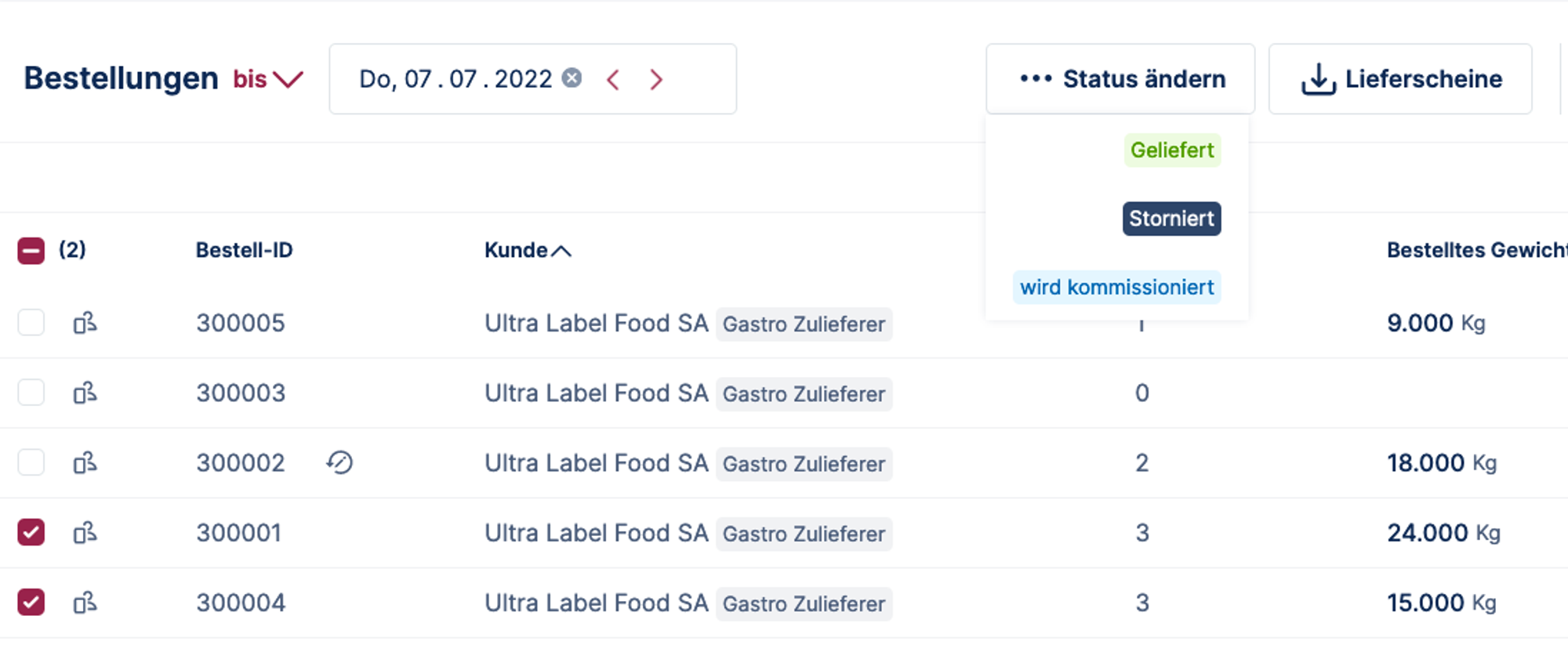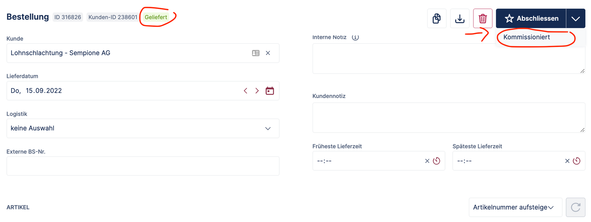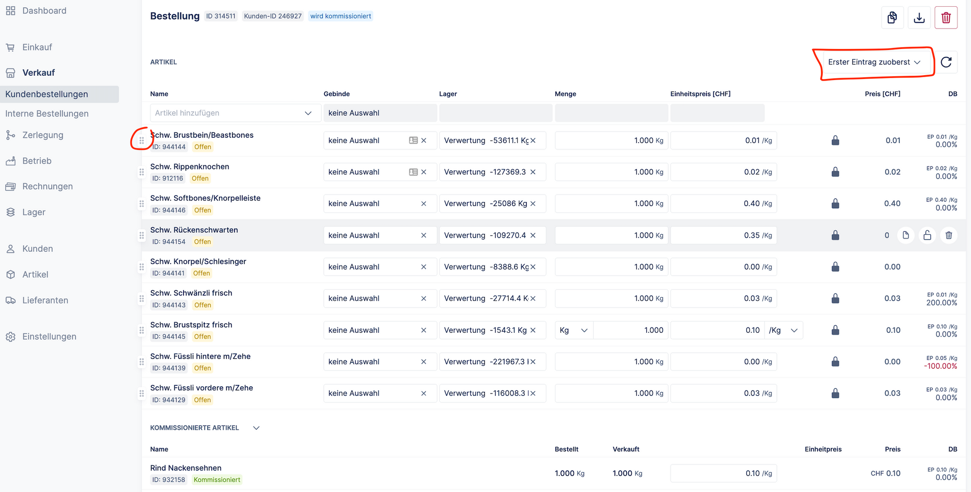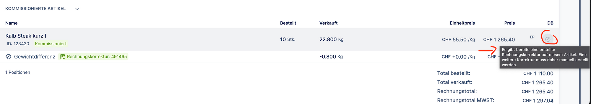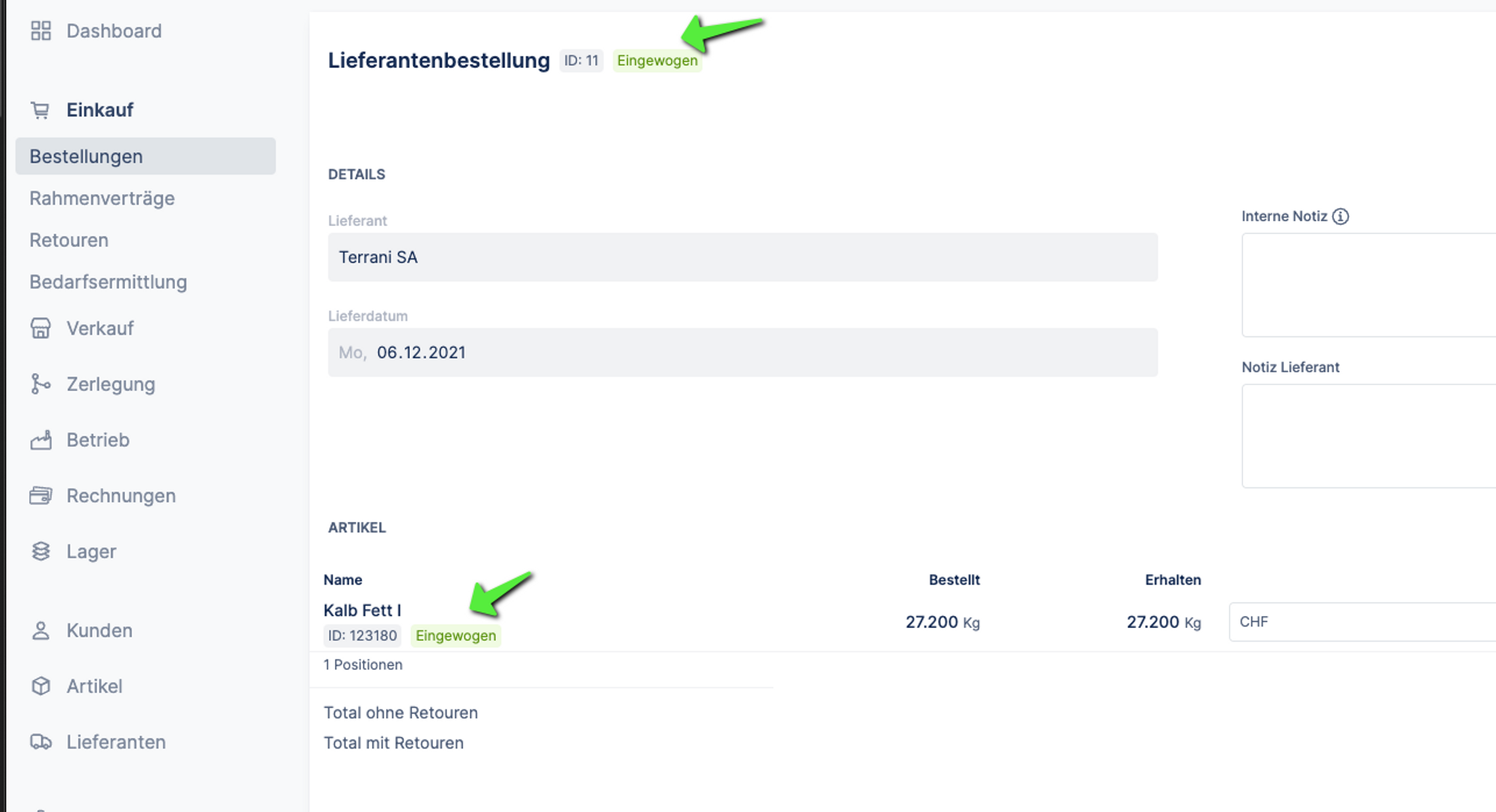 Wenn im Status zurück gegangen wird (z.B. von eingewogen auf bestellt), müssen bereits eingewogene Artikel manuell bearbeitet werden.