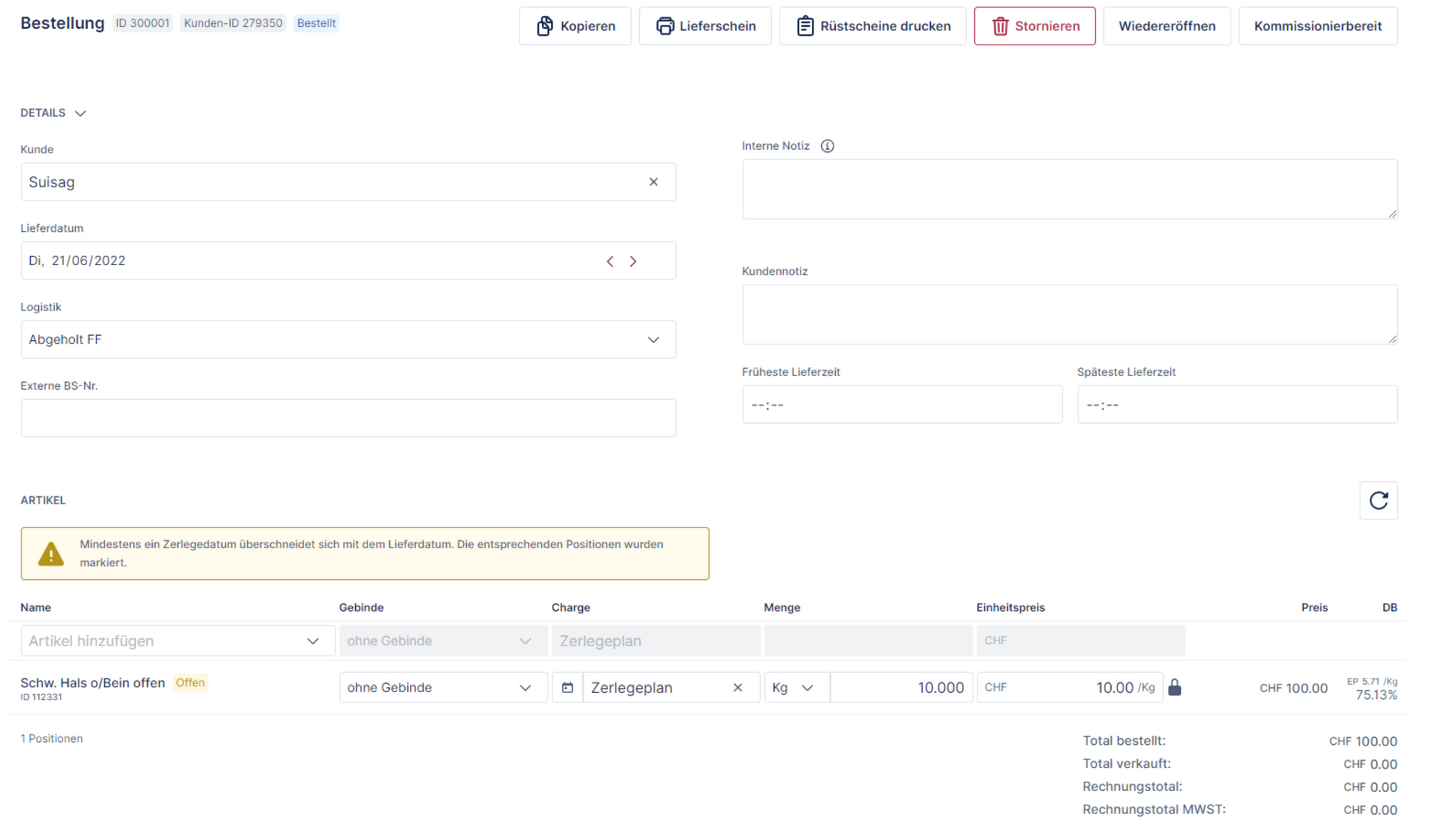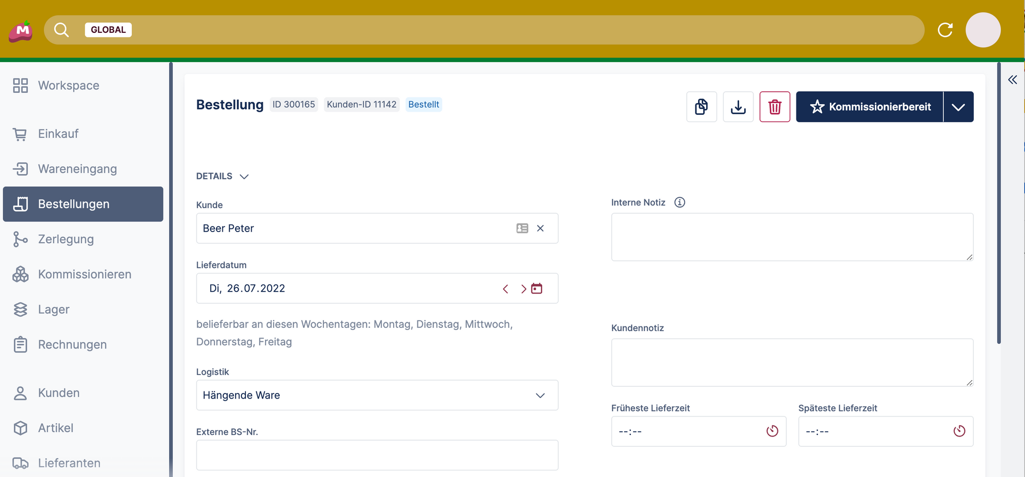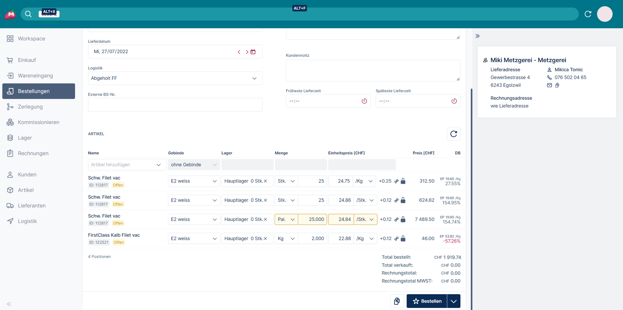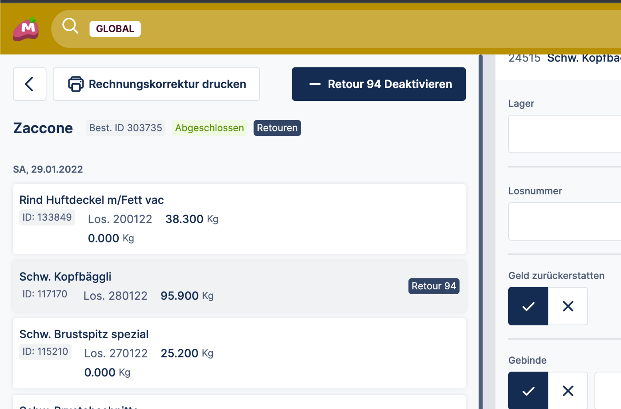 Wenn im Status zurück gegangen wird (z.B. von eingewogen auf bestellt), müssen bereits eingewogene Artikel manuell bearbeitet werden.