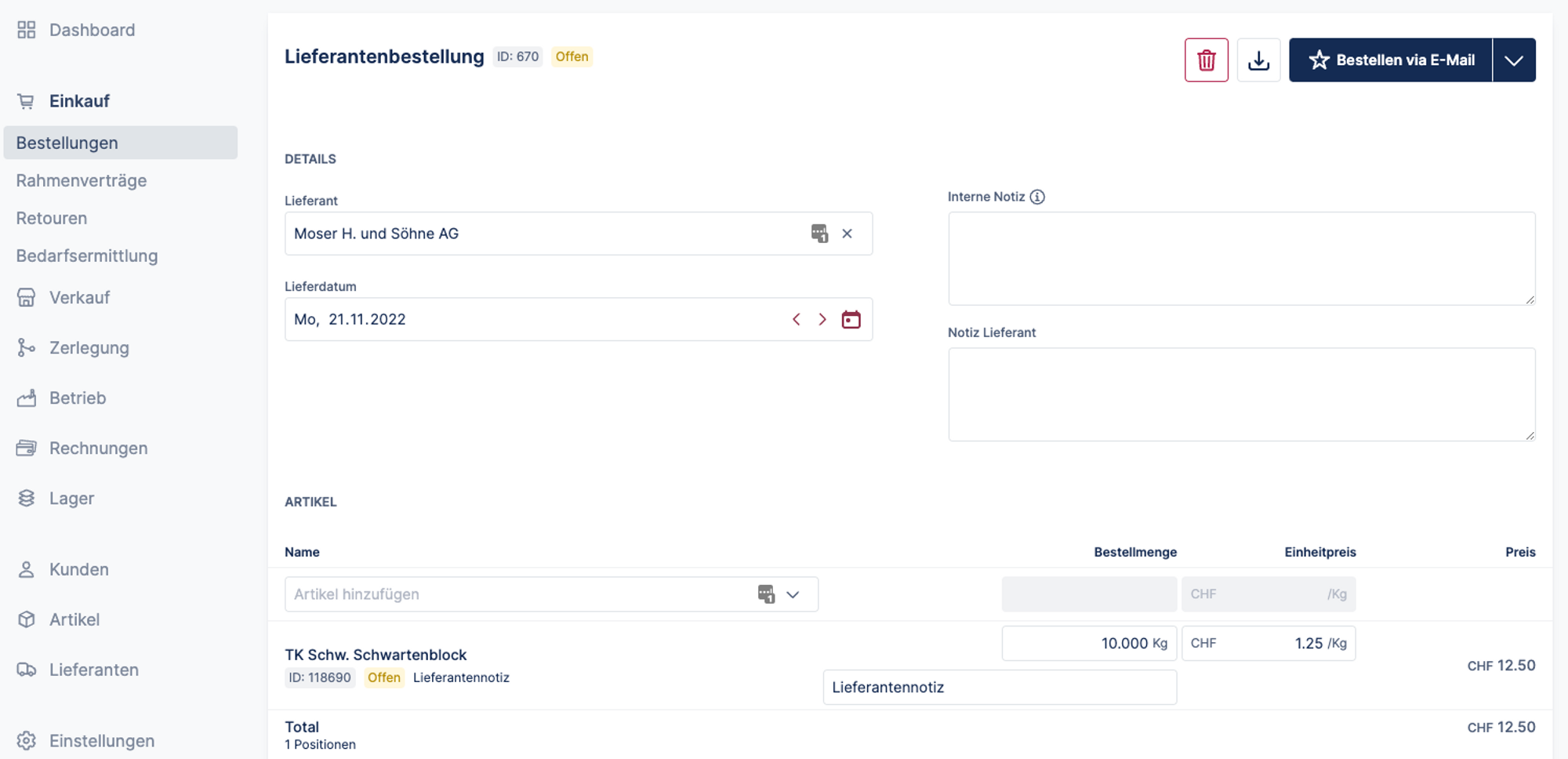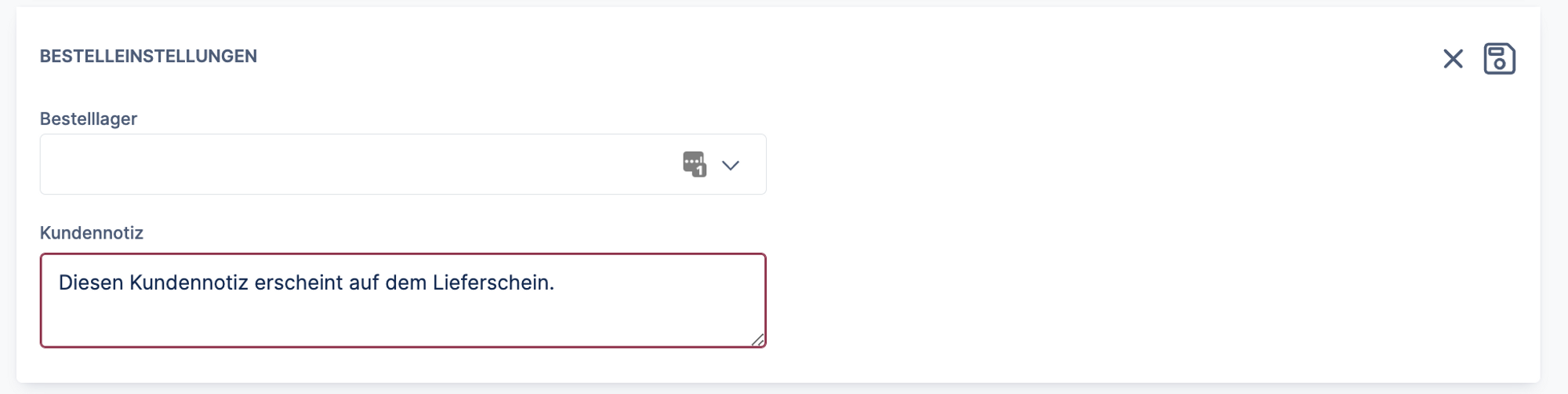 Die Lieferantennotiz der Artikel Stammdaten wird in die Bestellung übernommen und kann in der Bestellung geändert werden.