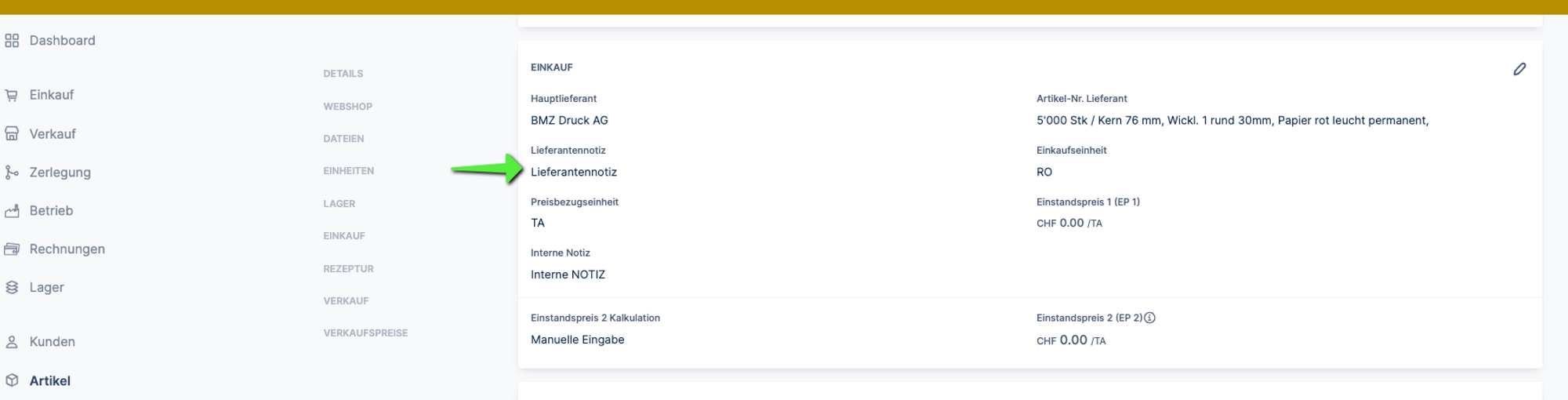 Unter Einkauf wird die Lieferanten- notiz korrekt gespeichert.
