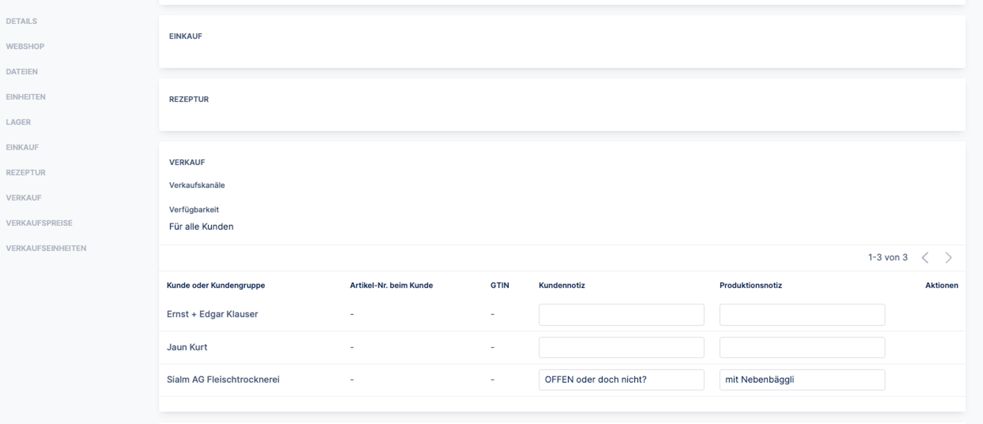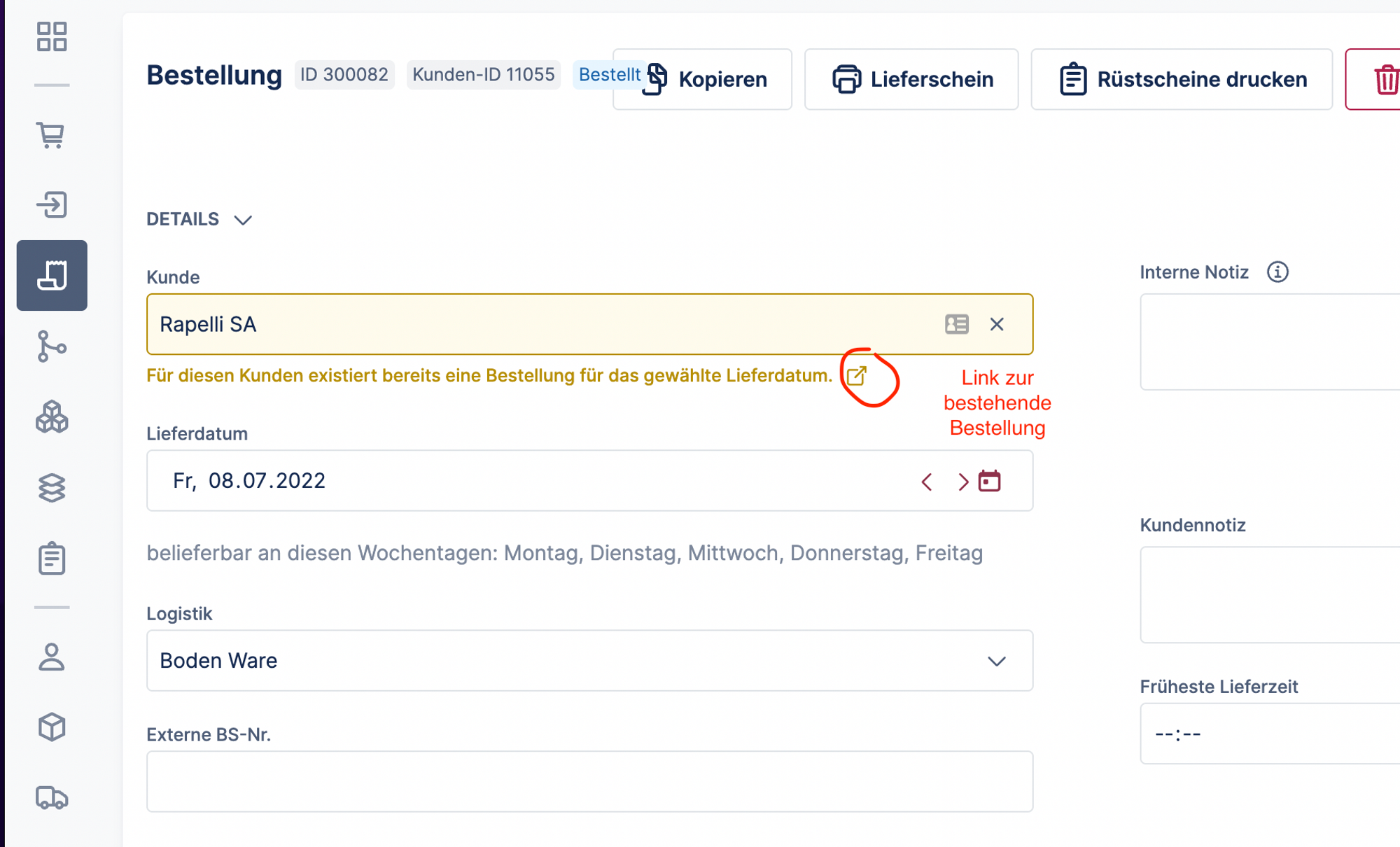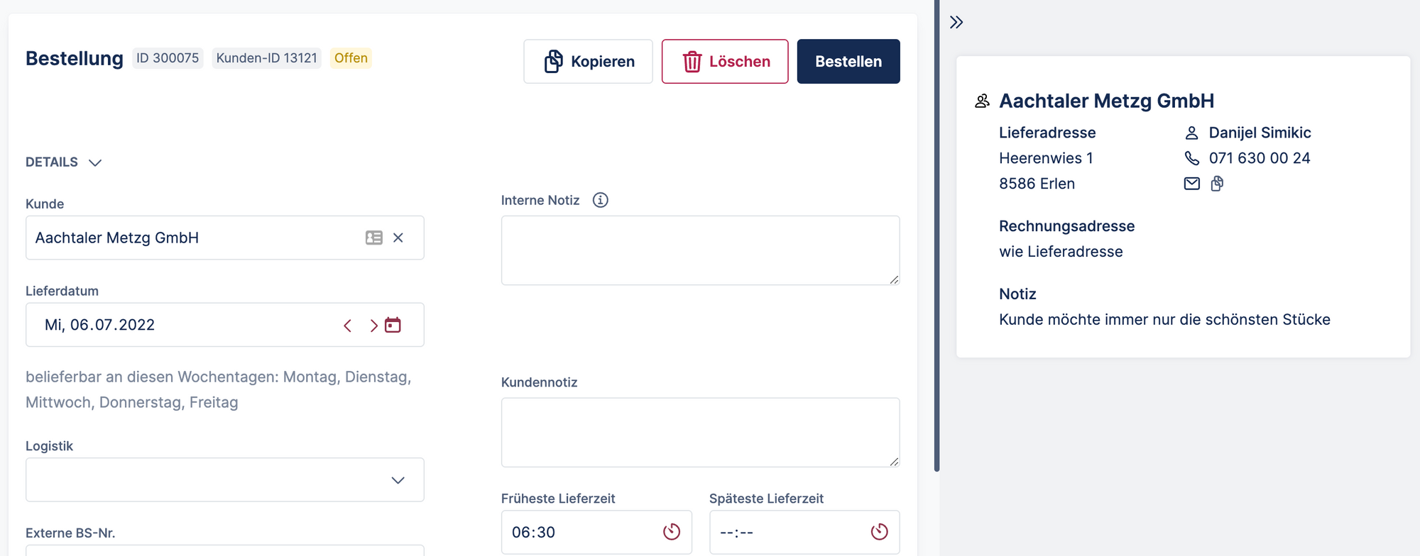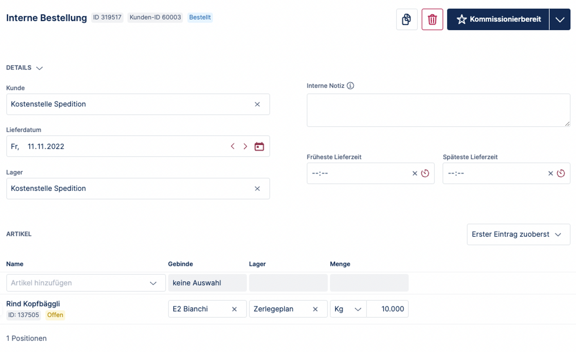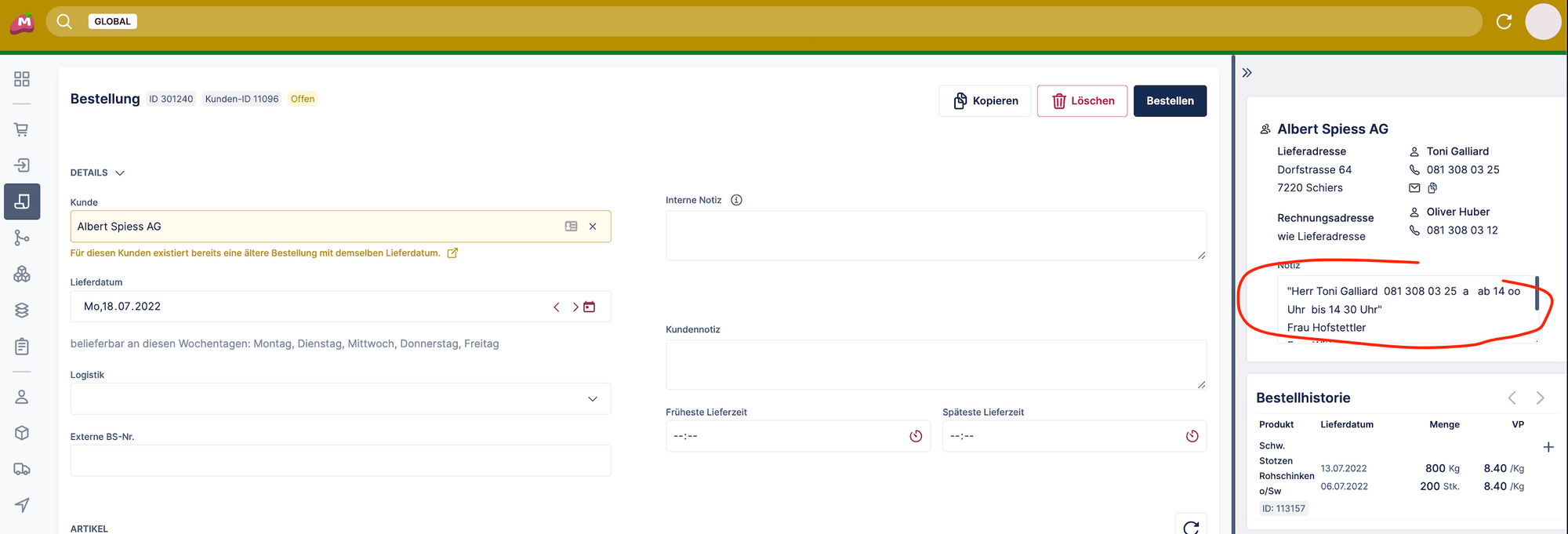 Nach dem Erfassen einer Position kann eine Produktionsnotiz und eine Kundennotiz eingegeben werden. Nach dem Kopieren einer internen Bestellung sind die Notizen der Artikel auch in die Bestellungskopie ersichtlich.