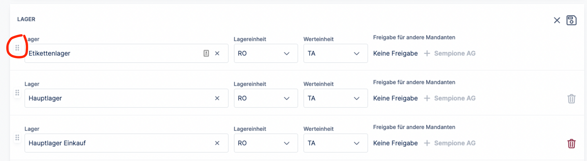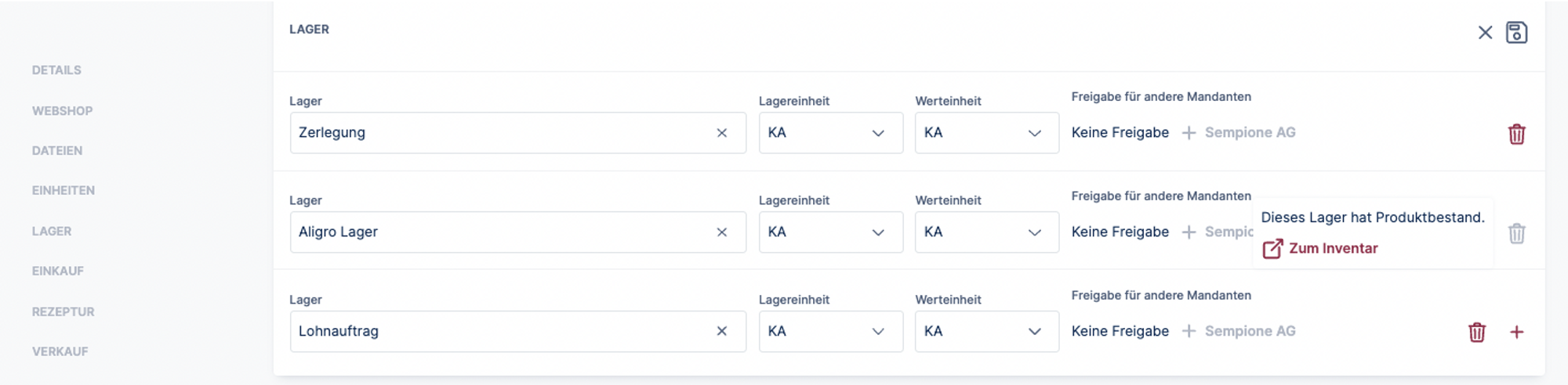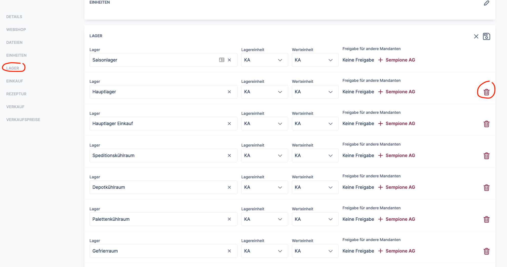 Lager können im Hintergrund deaktiviert werden, d.h. damit stehen sie in Lagerprozessen nicht mehr zur Verfügung. Artikel können auf ein deaktiviertes Lager berechtigt werden.