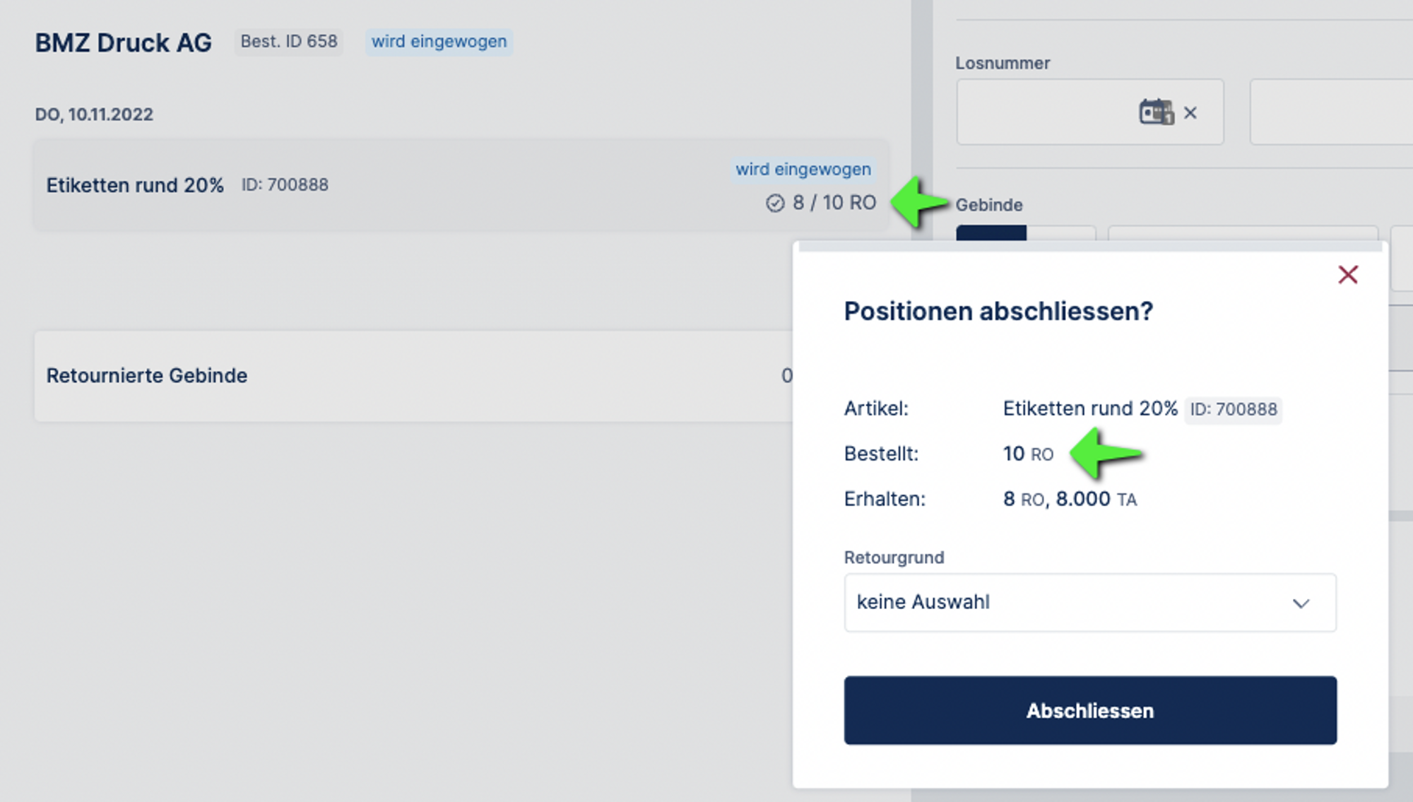 Wenn beim Wareneingang die korrekte Menge erfasst wird, ist kein Retourengrund zu erfassen, d.h. das Dropdown mit dem Grund erscheint in diesem Fall nicht.