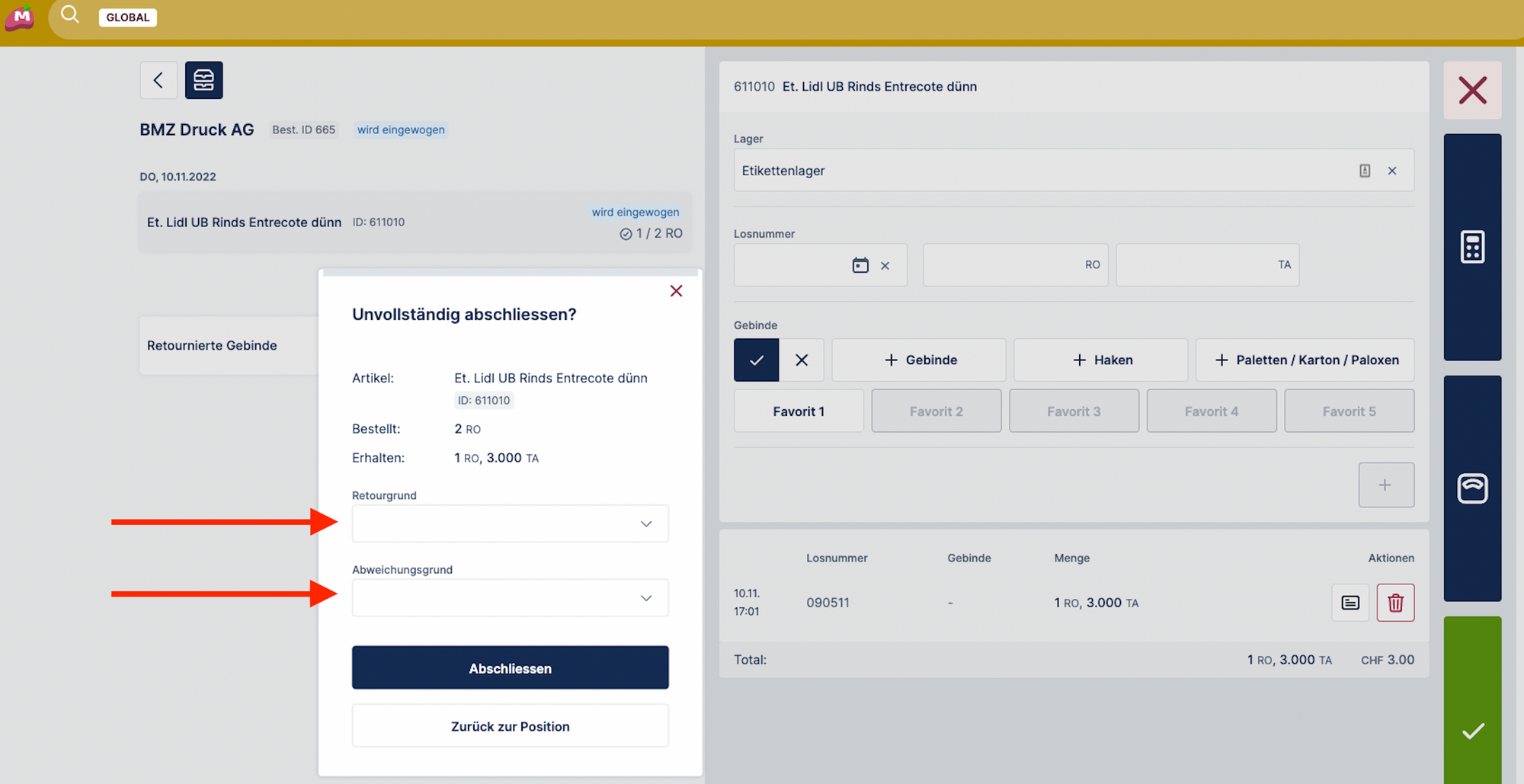 Wareneingang: Logik für die Anzeige der Abweichung beim Abschliessen ist korrigiert. Dies behebt der Fehler, bei dem das Abschliessen nicht möglich war, wenn keine Abweichung angezeigt wurde.