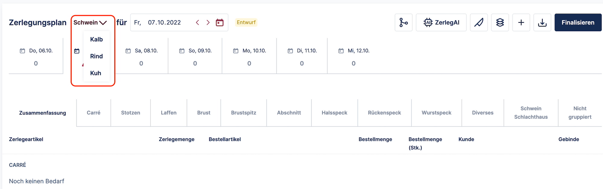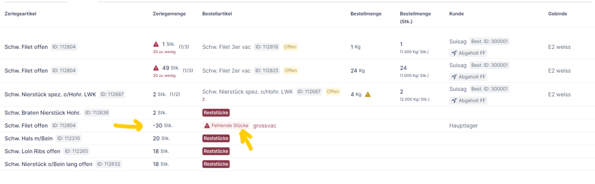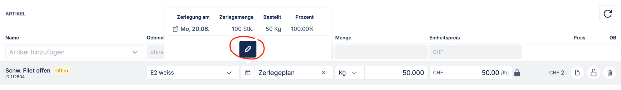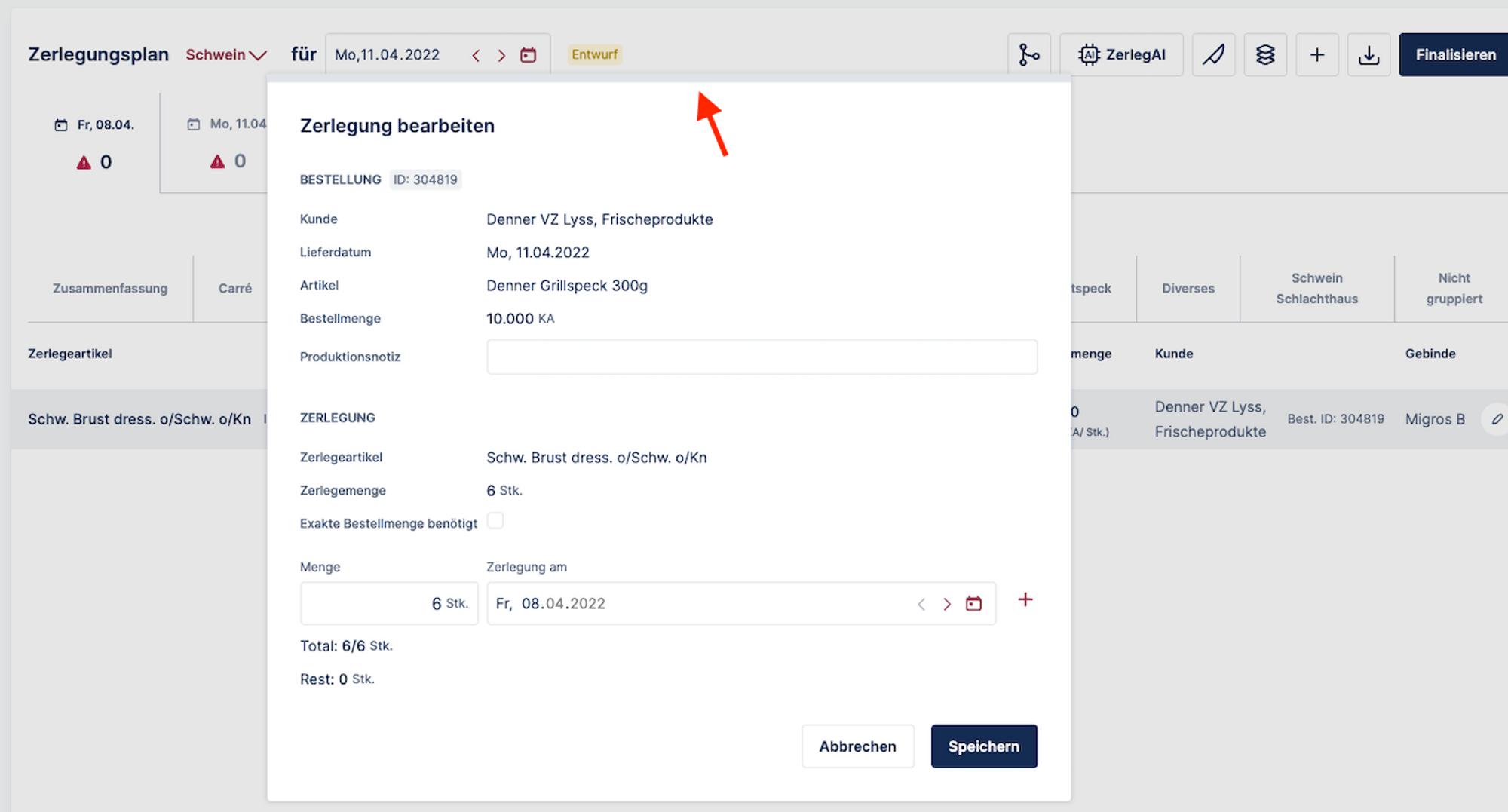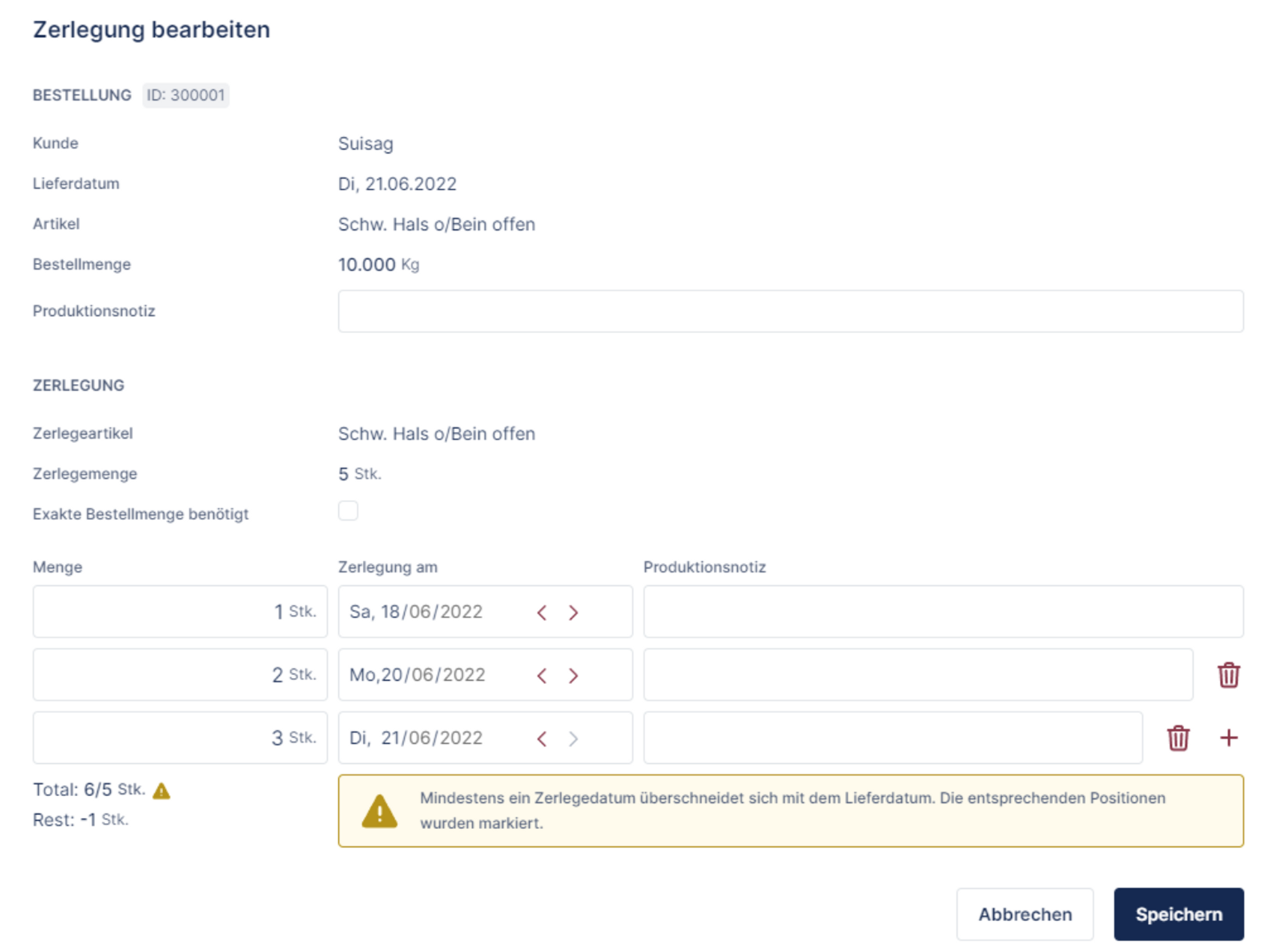 Angepasste Bestellmengen auf Zerlegeplan, falls Nachfrage aufgeteilt wurde
