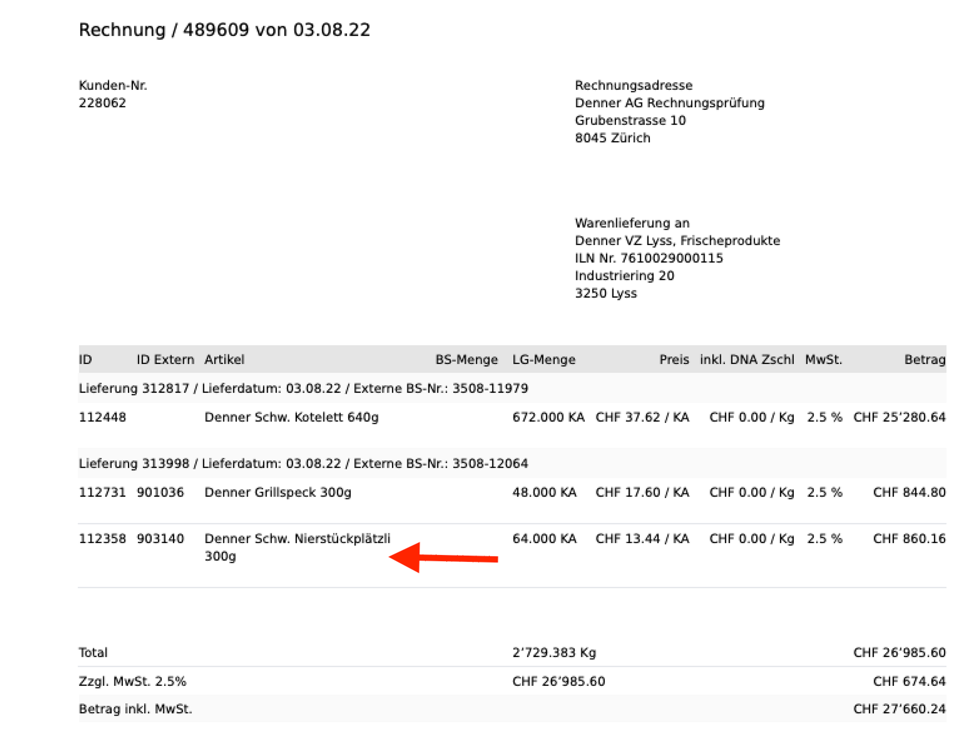 Lidl Lieferschein mit kg / KA und total Kg pro Produkt