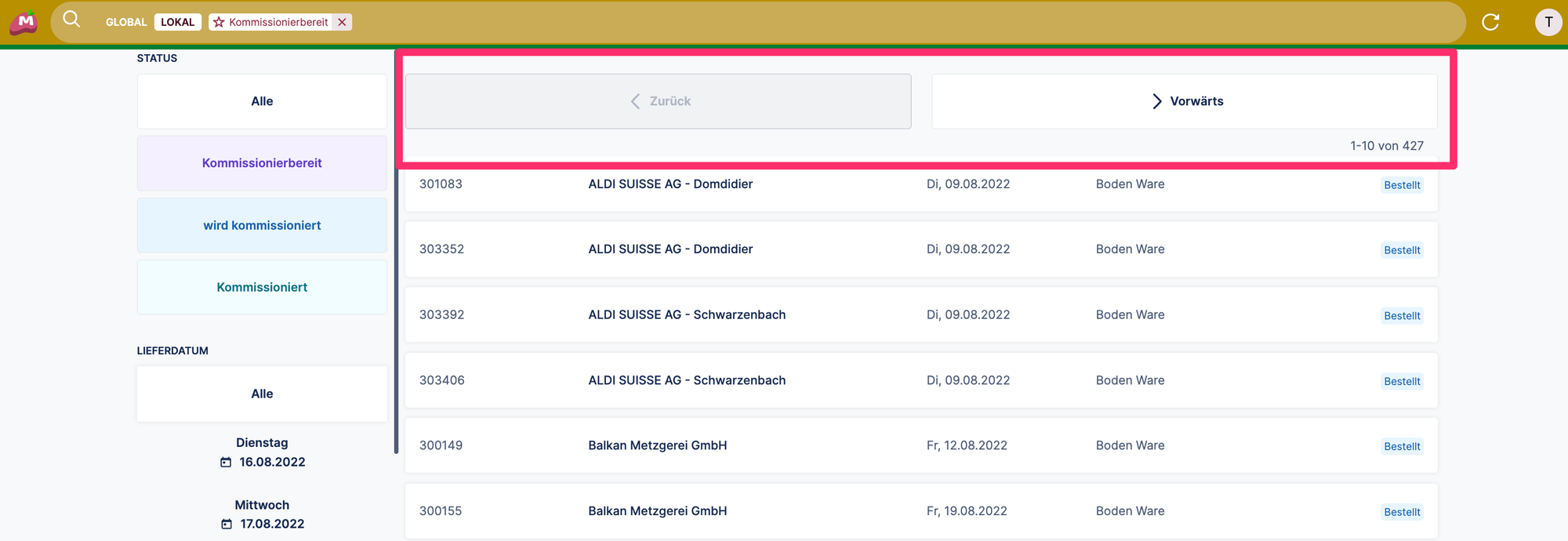 Statuswechsel mittels Button von kommissioniert nach wird kommissioniert entfernt.