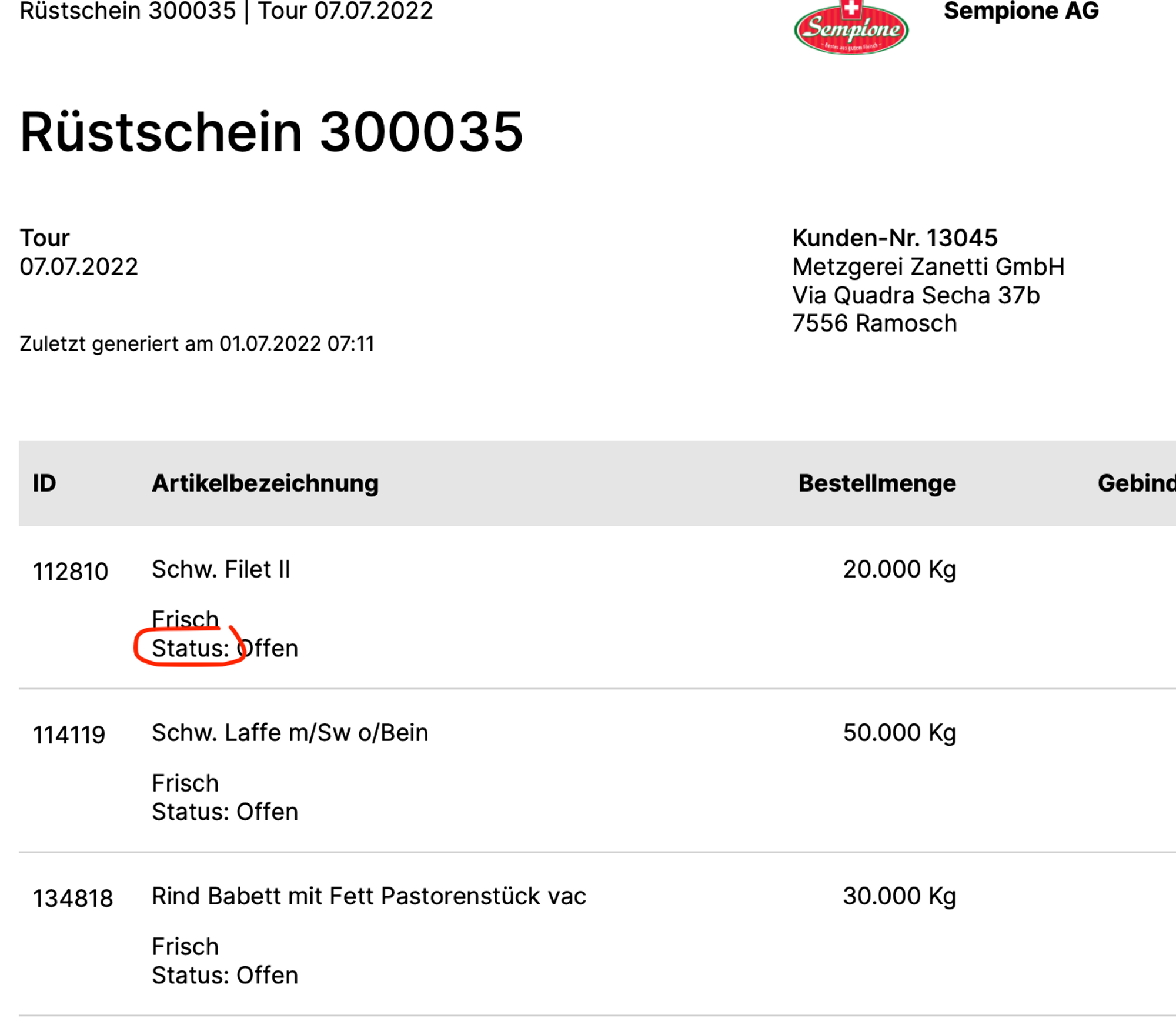 Sortierung der Rüstscheine im PDF gemäss der Auflistung in Meatico