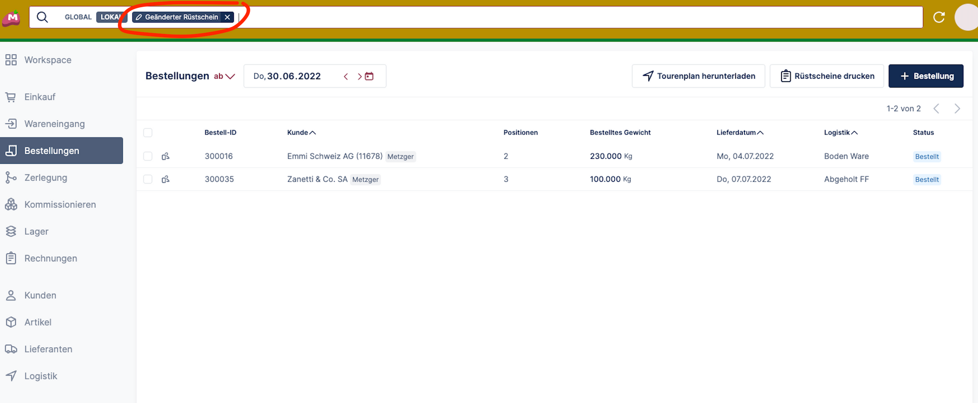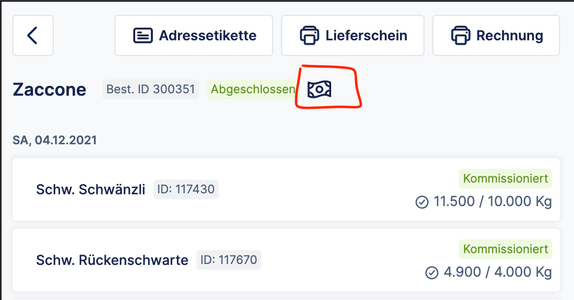 Wenn ein Artikel von eingewogen nochmals bearbeitet wird, ändert sich auch der Status der Bestellung auf wird eingewogen.
