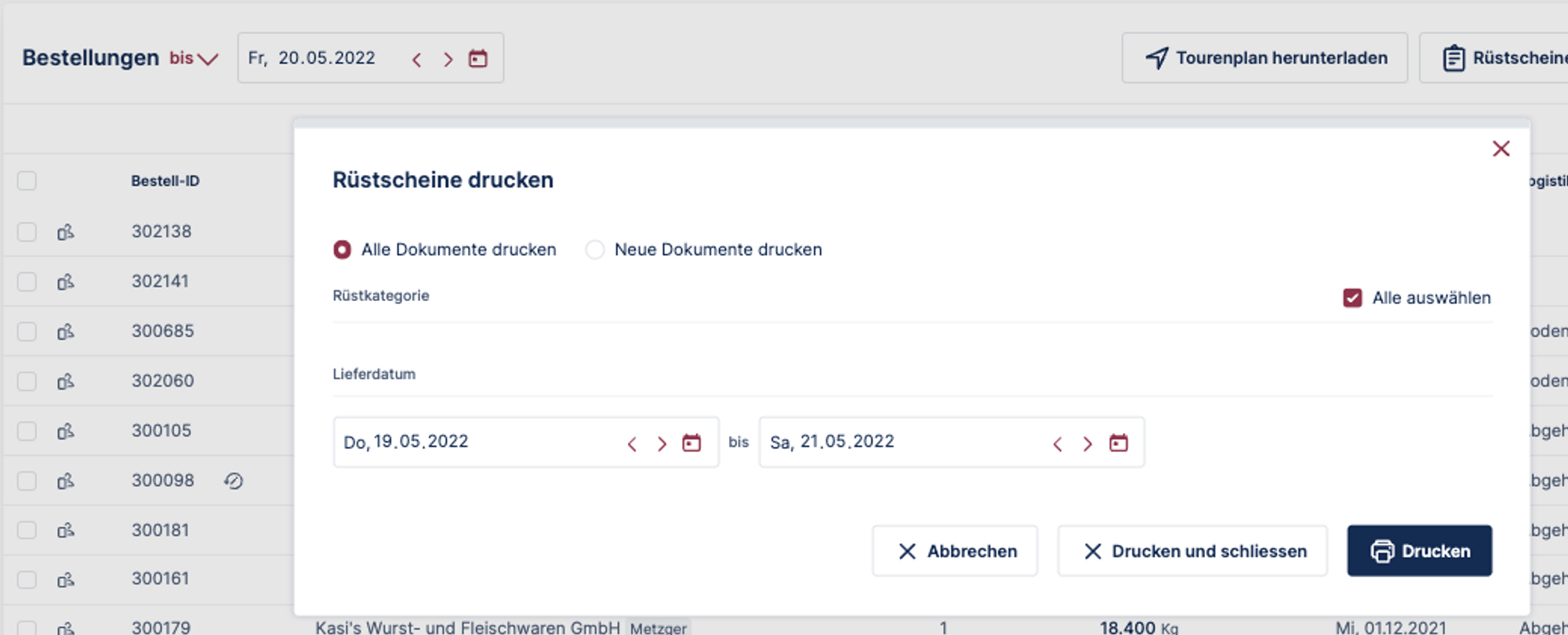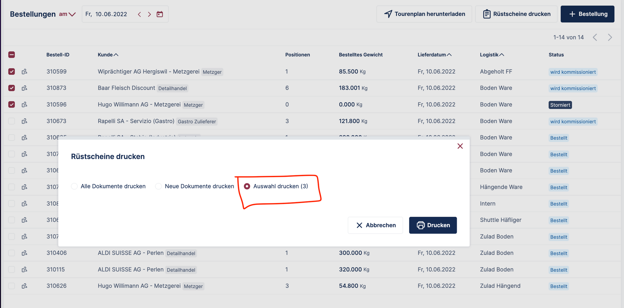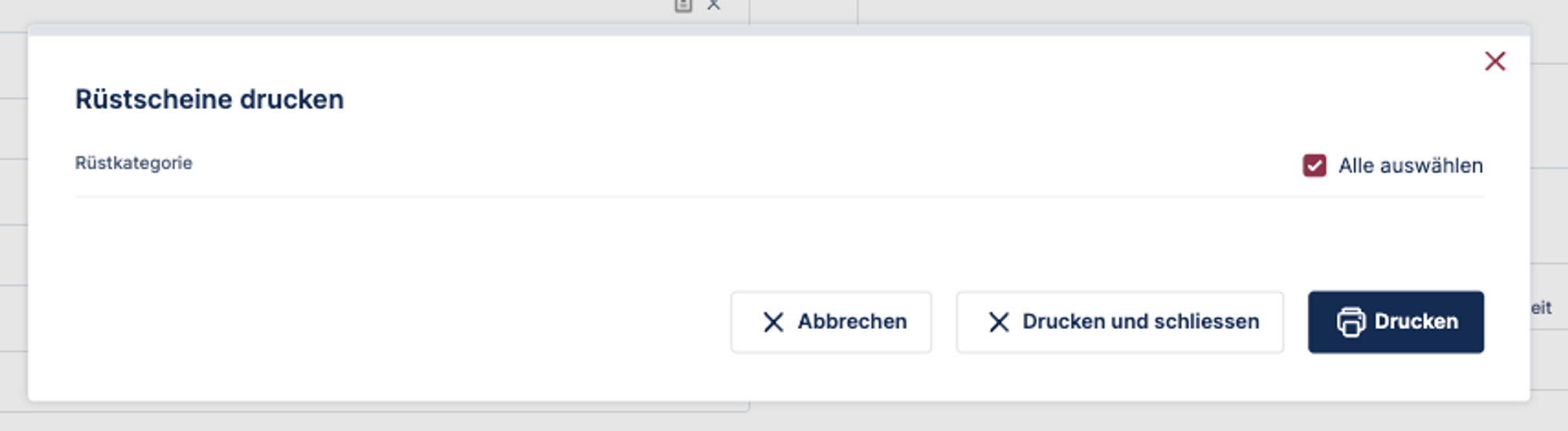 Rüstscheine können für mehrere ausgewählte Positionen gleichzeitig gedruckt werden