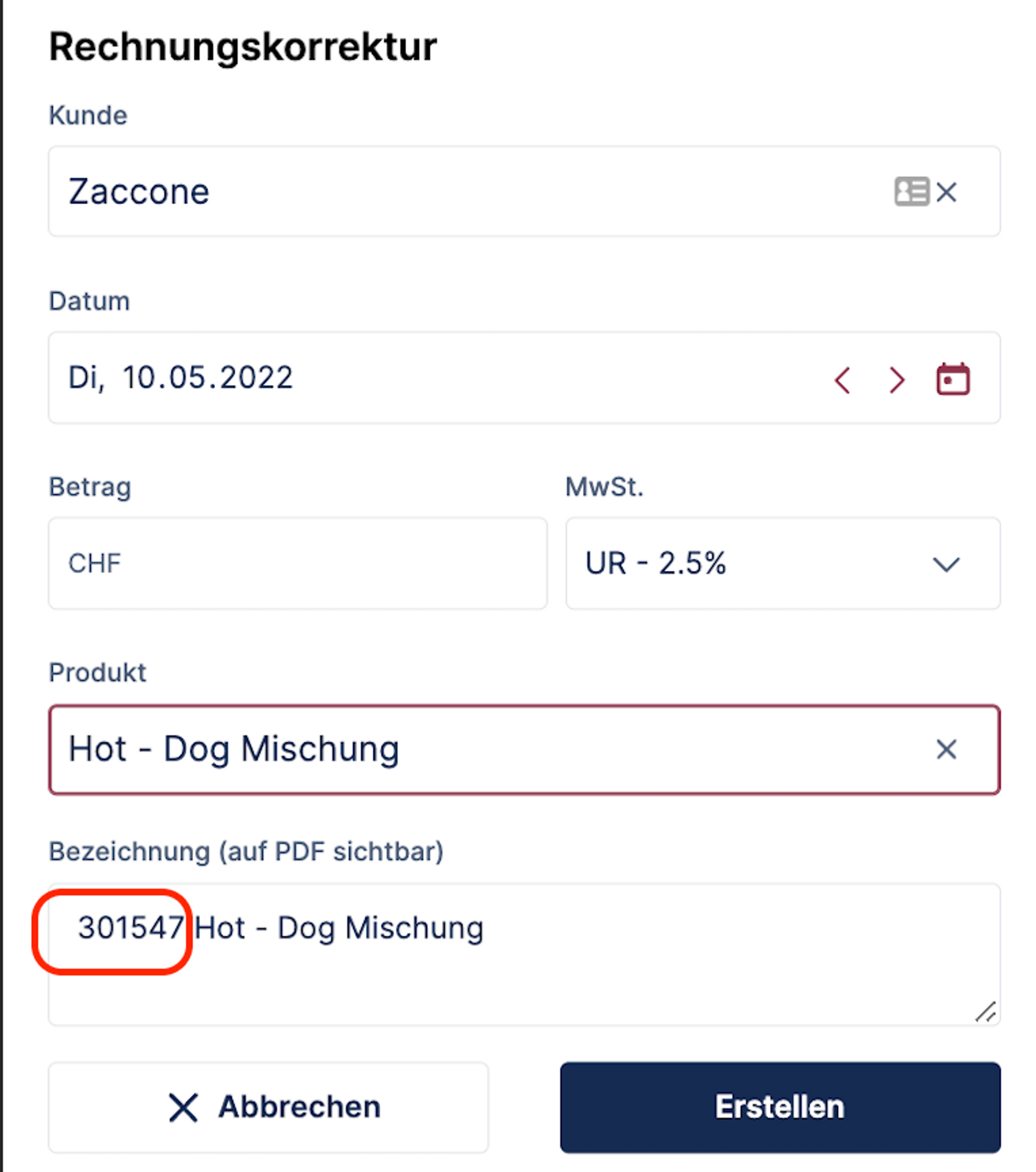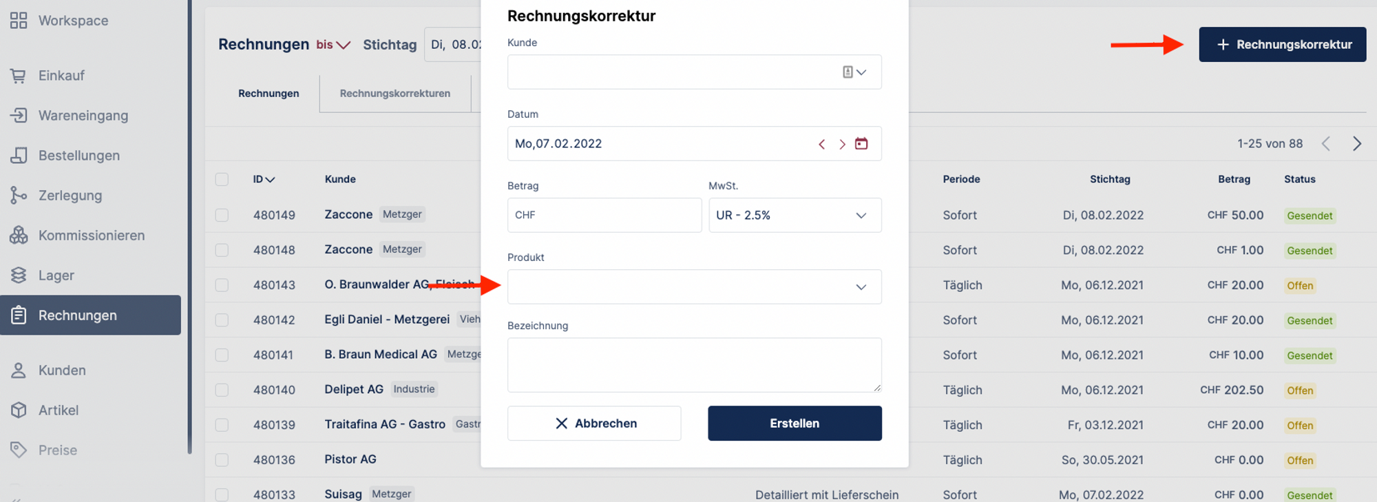 Manuelle Rechnungskorrektur (Gutschrift / Nachbelastung) mit Referenz auf Artikel möglich