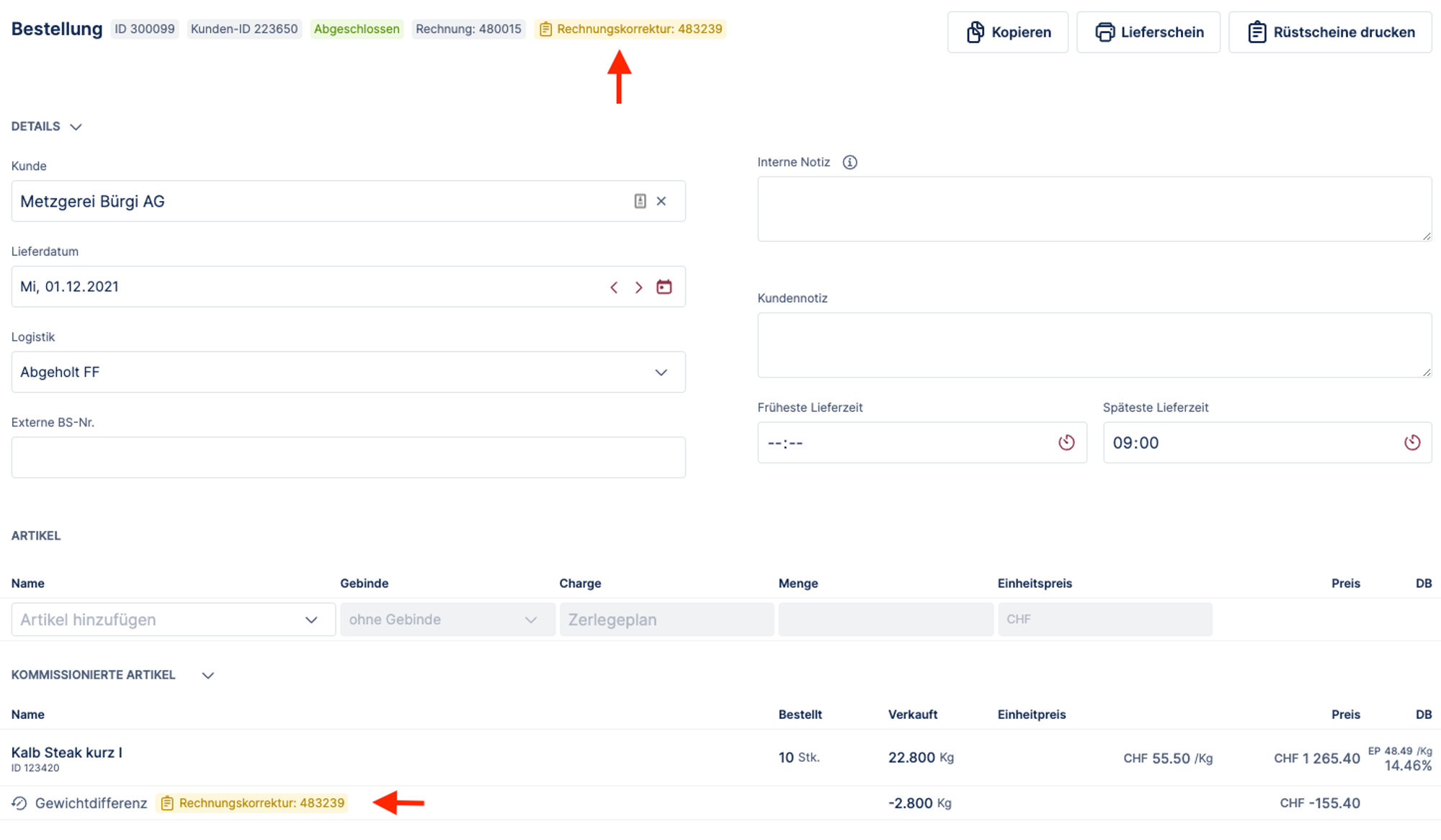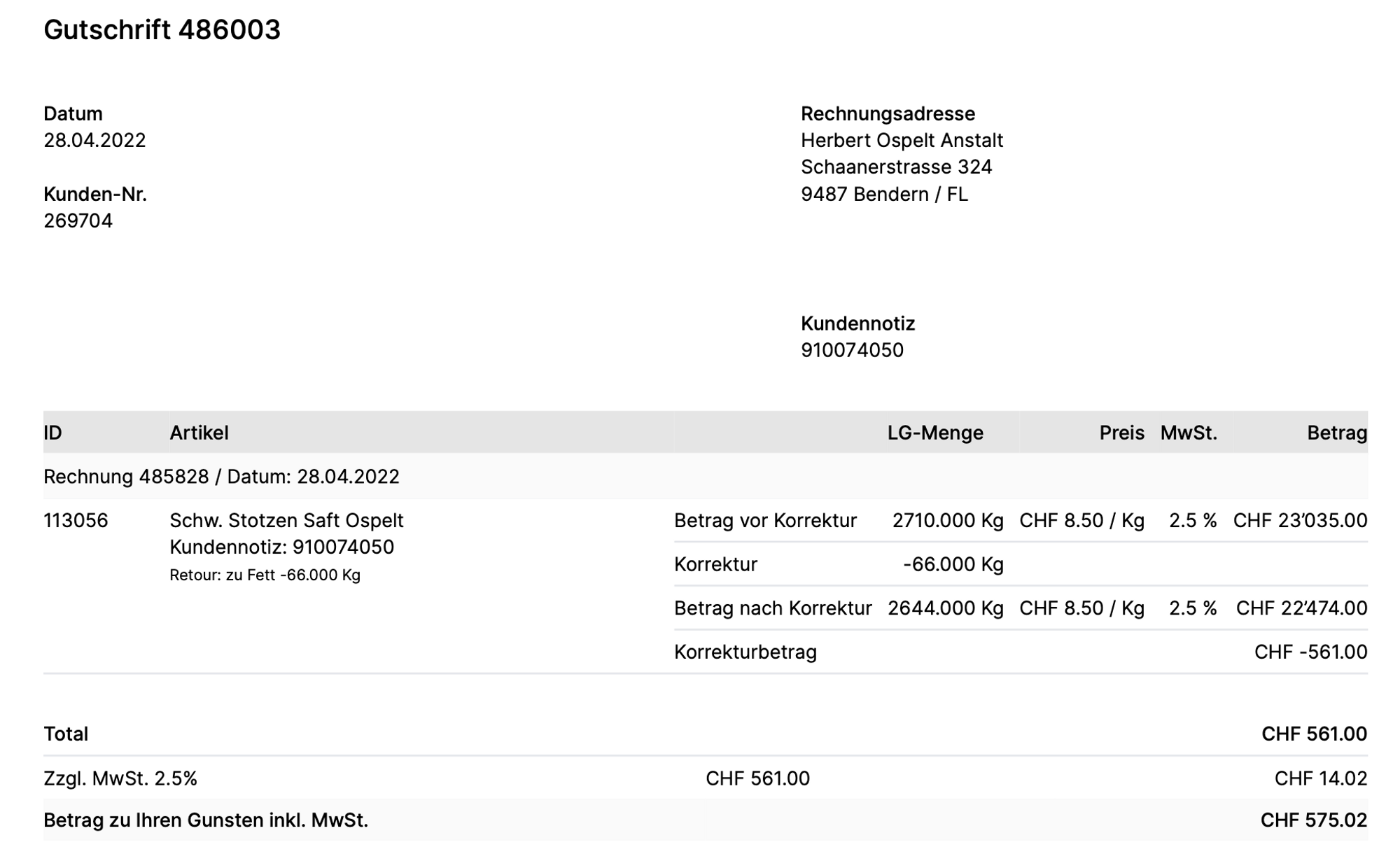 Rechnungen und Gutschriften mit klarerer Ausweisung von Korrekturen (Gewicht, Preis)