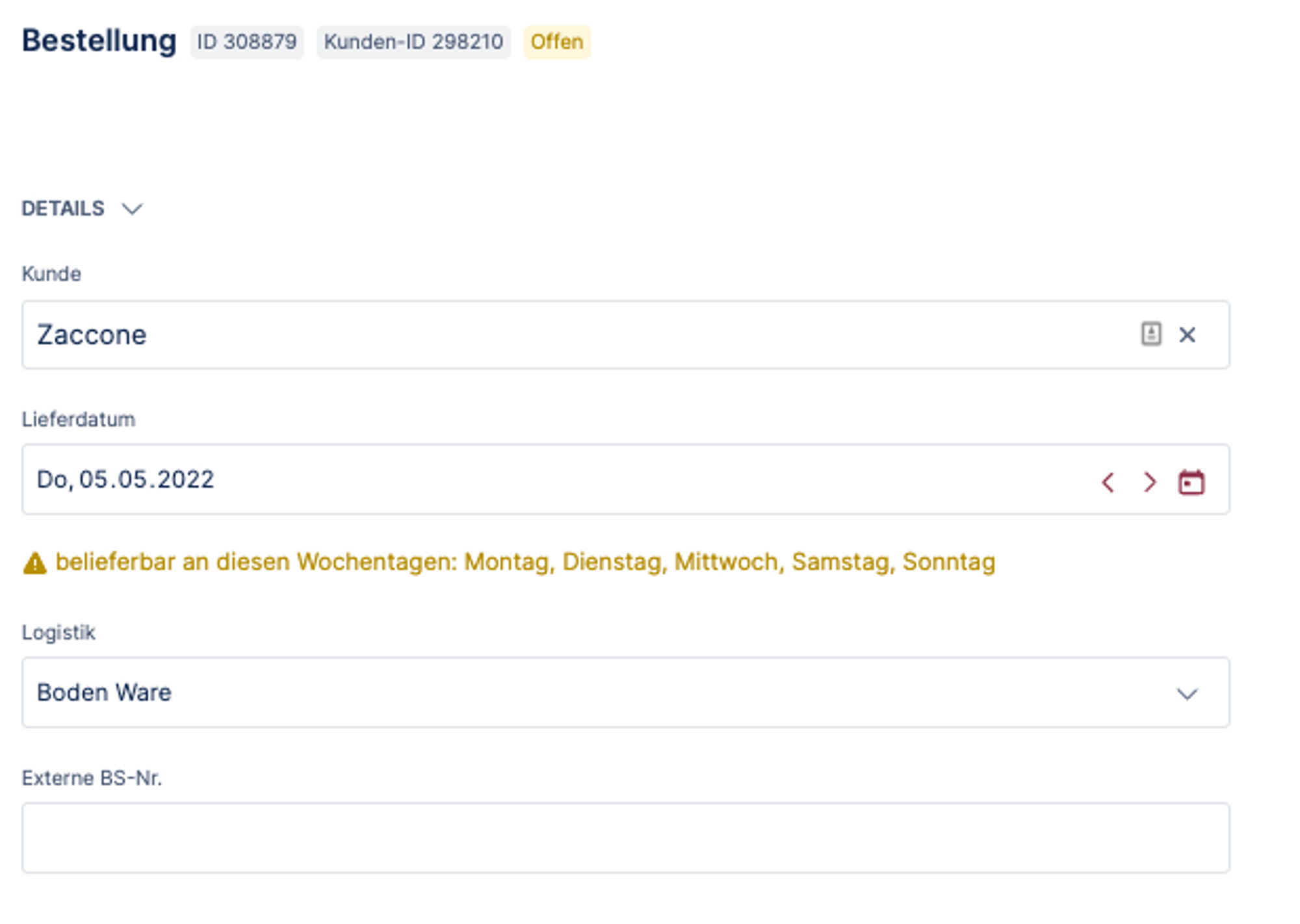 Kundenbestellungen: Das Lieferdatum wird angezeigt, kann jedoch nicht verändert werden.