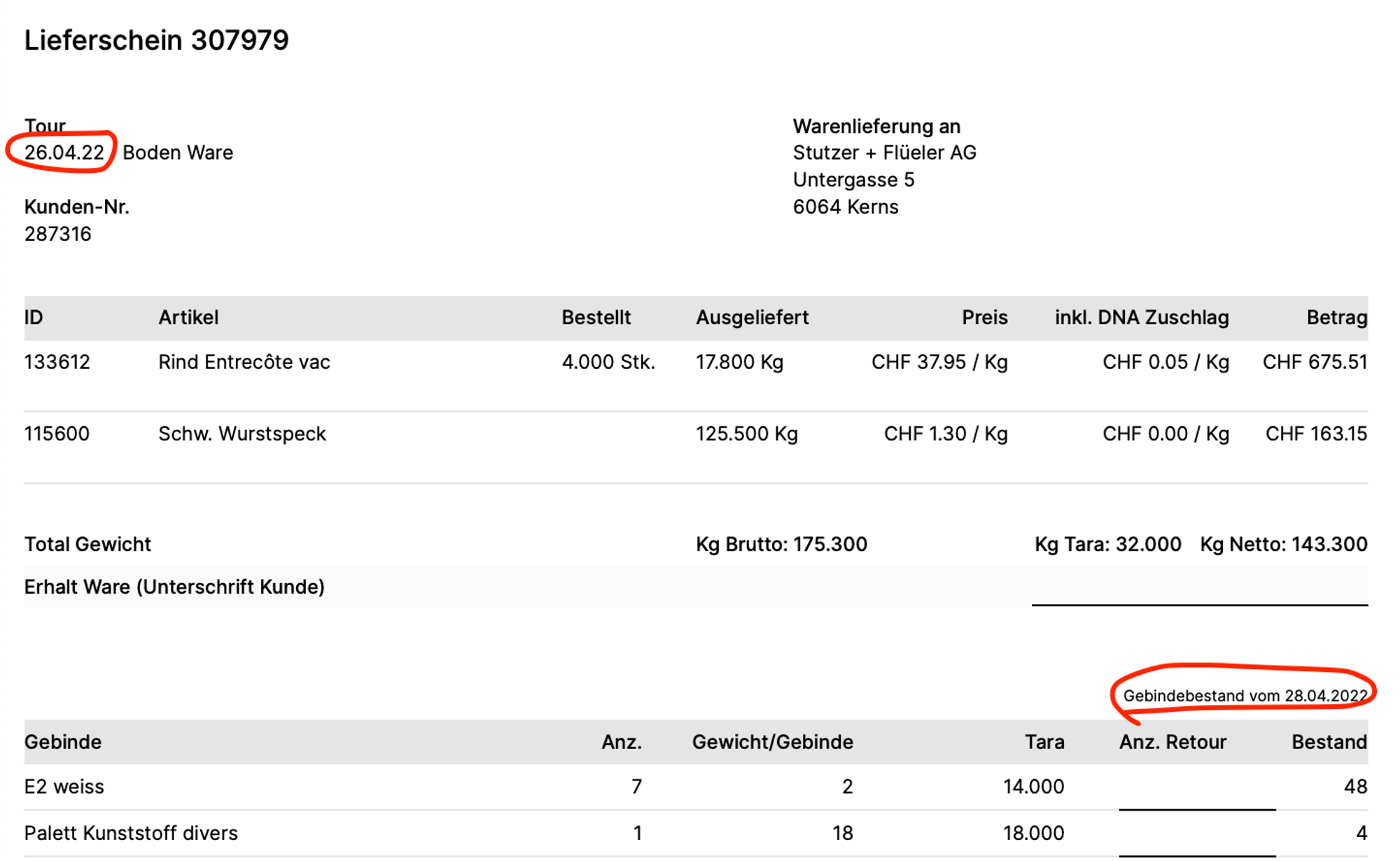 Gebindesaldo auf Lieferschein und sofort Rechnung